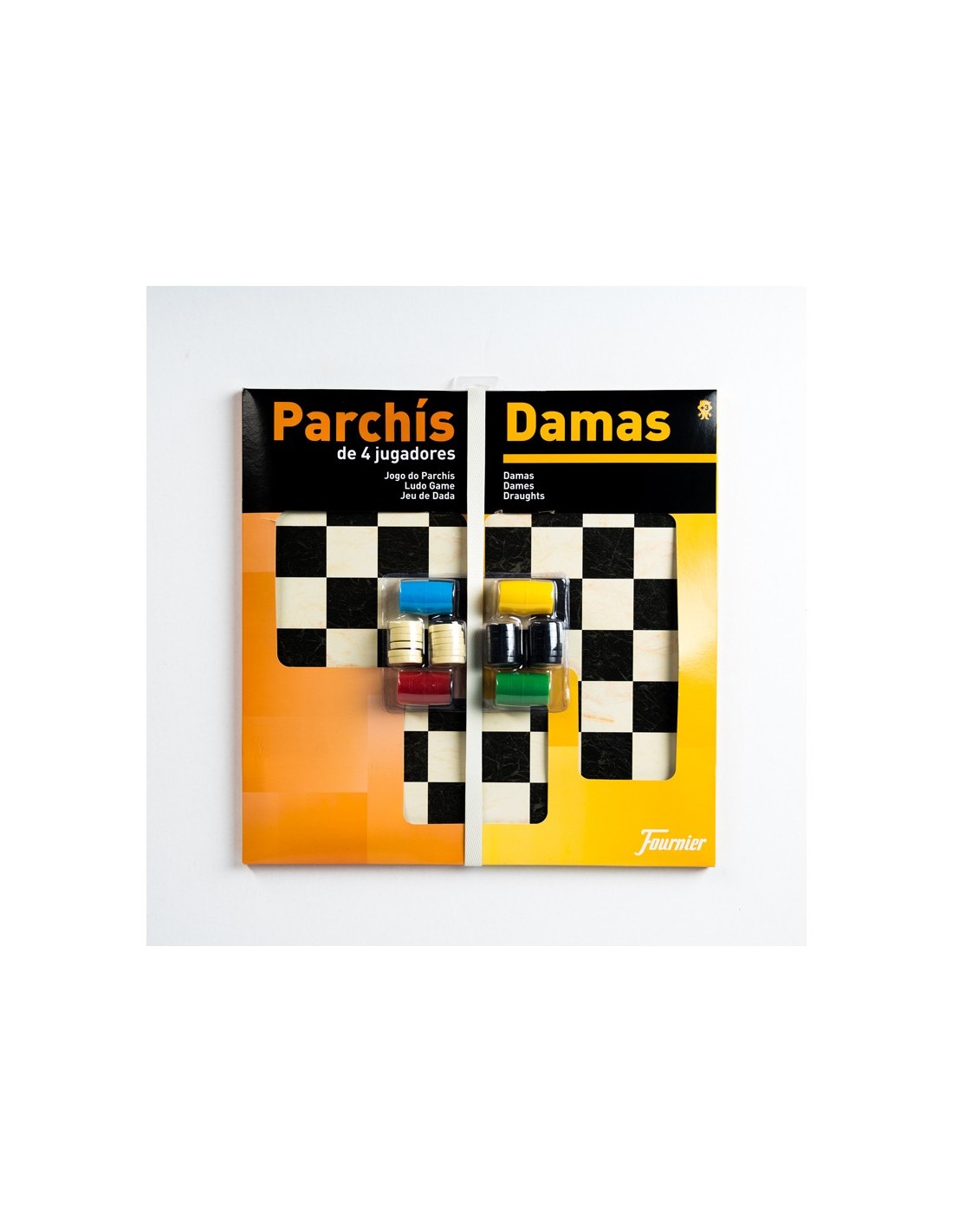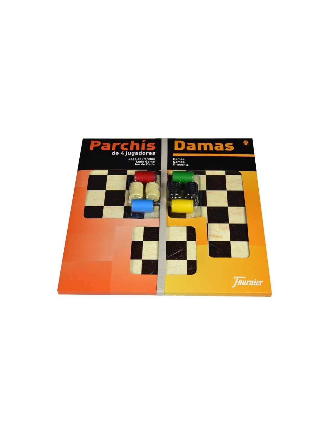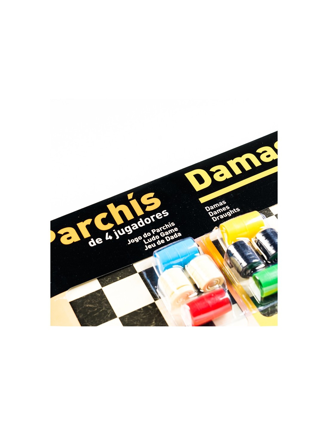 Juego de parchís para 4 jugadores con damas. Contiene: tablero, 4 cubiletes, 4 dados y fichas de 4 colores. Fichas de damas de plástico. Caja para guardar accesorios. Medidas: 400 x 400 mm.