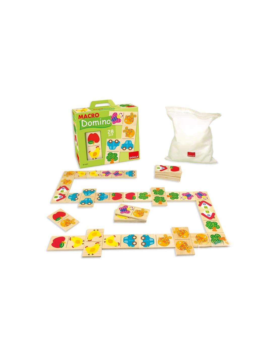 Tradicional dominó de 28 piezas de madera de 12 x 6 cm. Serigrafiadas. Caja con ventana y bolsita para guardar las piezas. A partir de 1 año. 1 o más jugadores. Medidas: 25,5 x 16,4 x 7,5 cm.