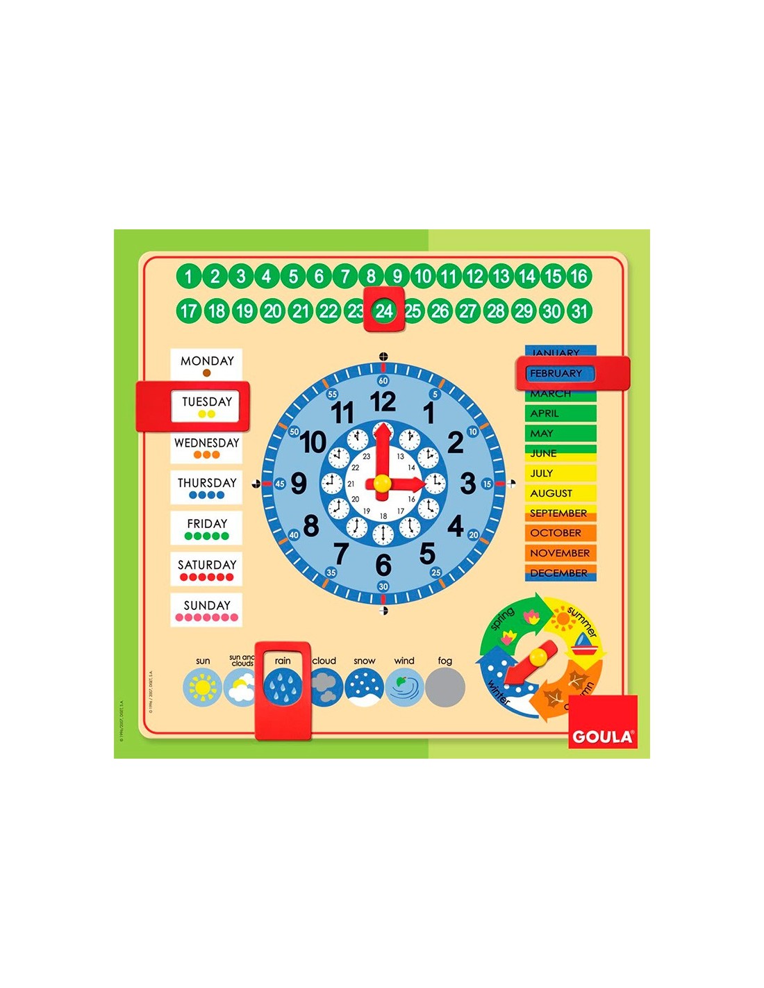 RELOJ CALENDARIO CON LOS MESES, LAS ESTACIONES, EL TIEMPO, LOS DIAS, LAS HORAS Y LOS MINUTOS. MAS COMPLETO Y MEJORADO PARA FACILITAR EL USO Y EL APRENDIZAJE DE LOS MAS PEQUEN?OS. NUEVO SISTEMA DE FICHAS MOVILES NO EXTRAIBLES PARA EVITAR SU PERDIDA. A PARTIR DE 2 AN?OS. 1 O MAS JUGADORES. MEDIDAS: 44 X 44 X 3 CM.