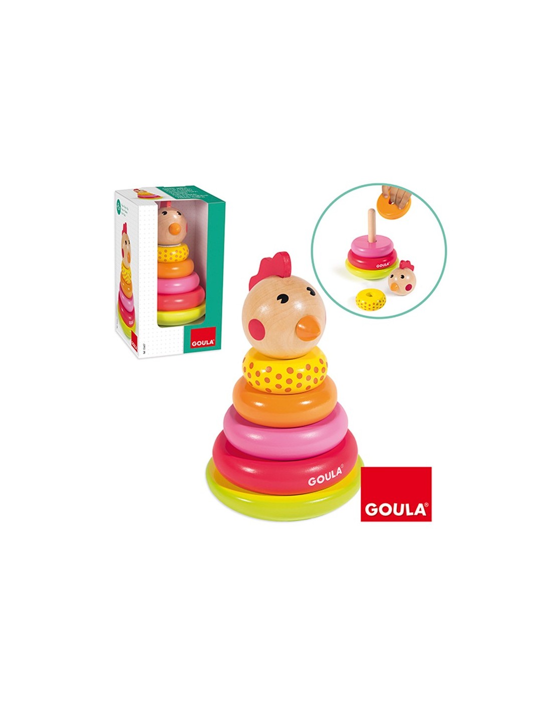 Apilable para bebés. Para montar en la base de madera los diferentes aros de colores y acabar con una cabeza de gallina. Indicado para aprender a diferenciar los tamaños y colores. Incluye: 1 base de madera, 4 anillas de colores y 1 cabeza de gallina. A partir de 18 meses. Medidas: 18 x 10,5 x 10,5 cm.