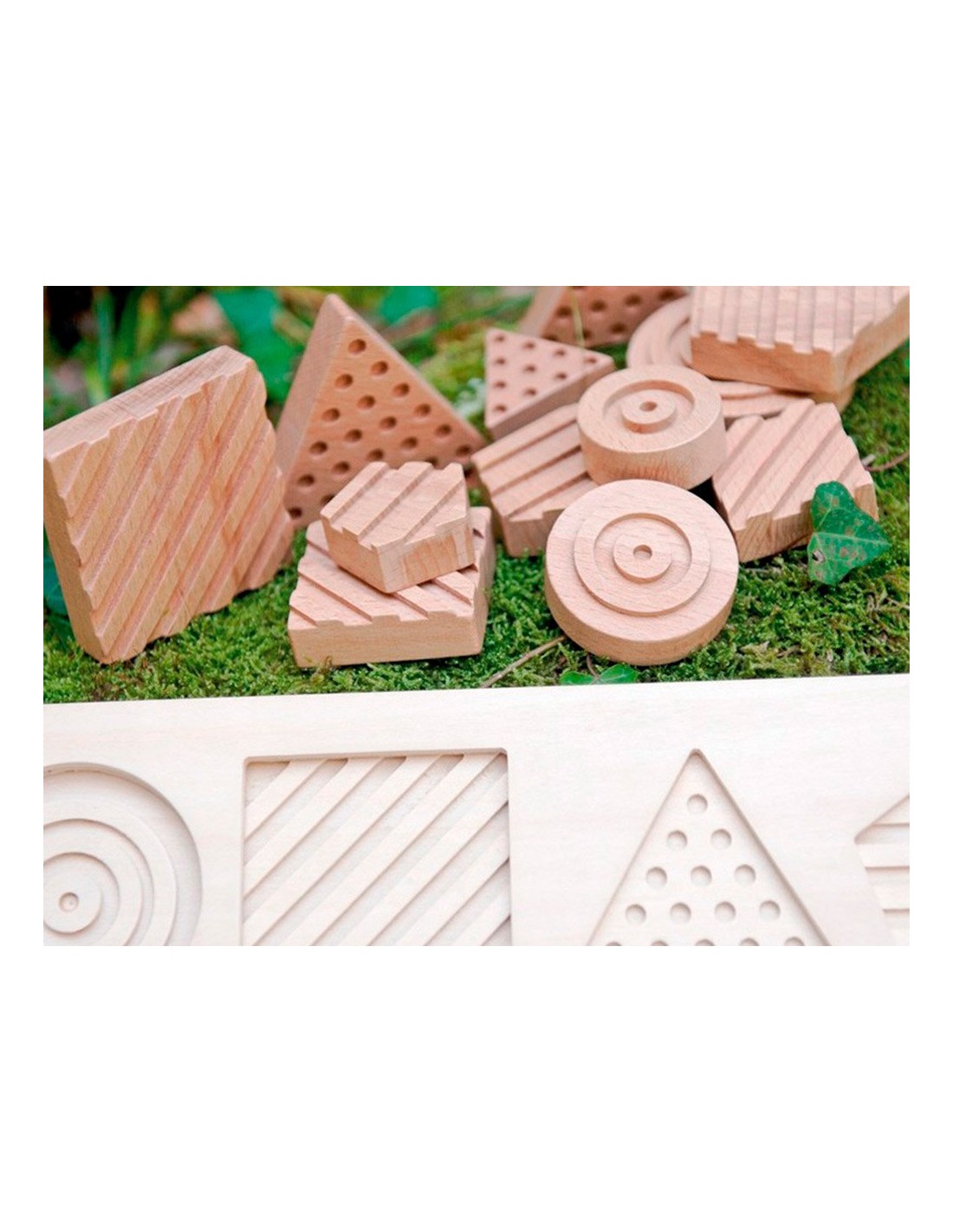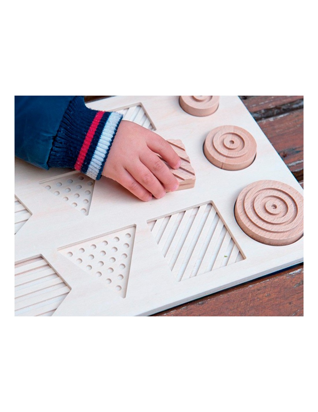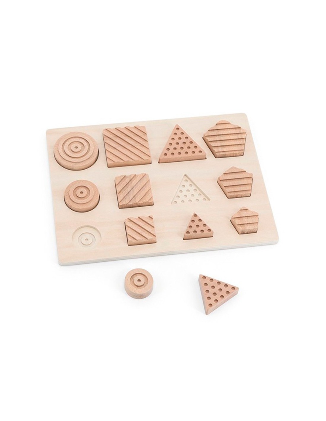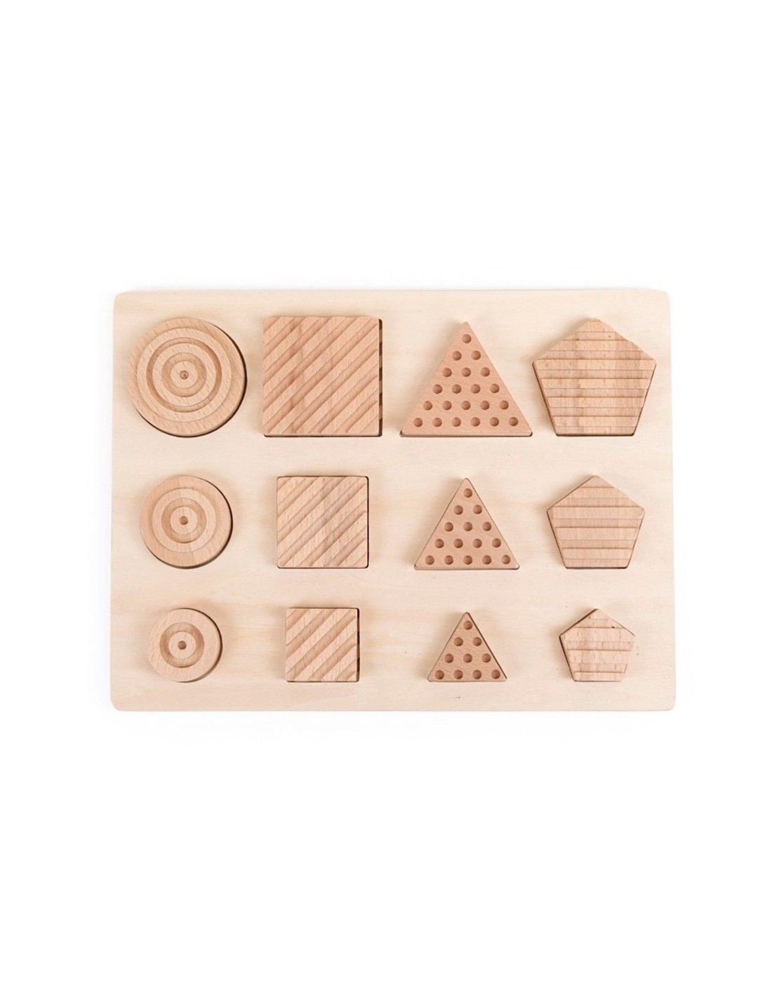Encaje sensorial de 12 piezas, fabricado en madera natural. Compuesto por 4 formas geométricas, 4 grabados distintos y 3 tamaños. Agudiza el desarrollo sensorial y la clasificación de las diferentes piezas, según su tamaño, forma geométrica y relieve. Material didáctico idóneo para trabajar el reconocimiento táctil. También para niños o personas con algun tipo de diversidad funcional y/o el colectivo de personas mayores.