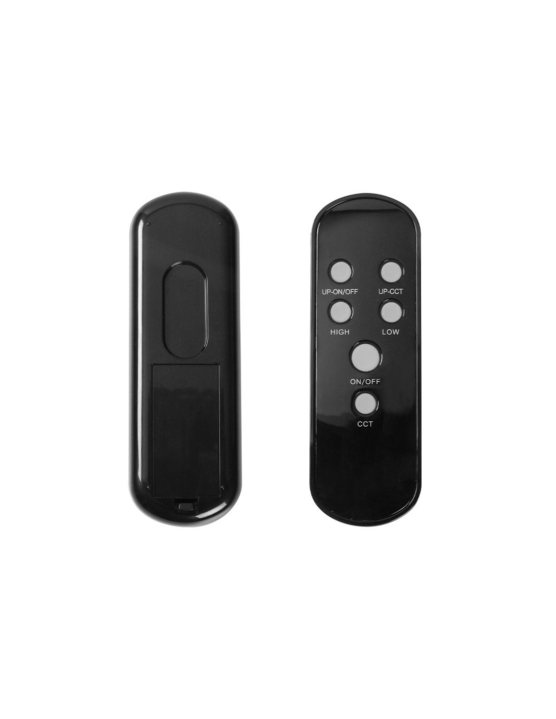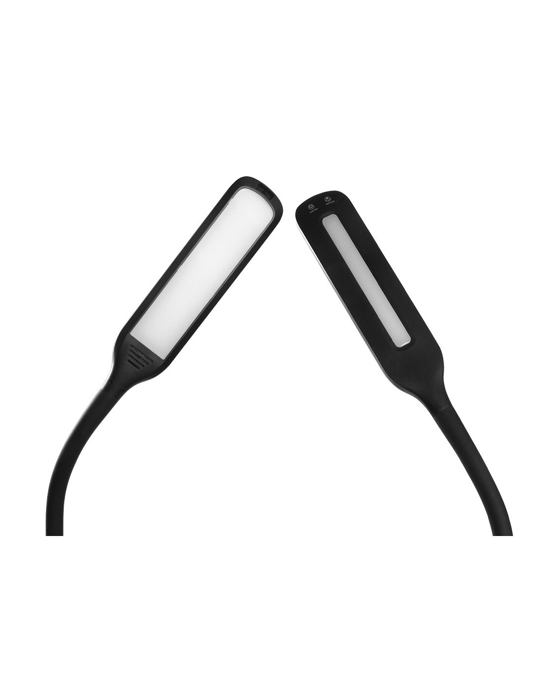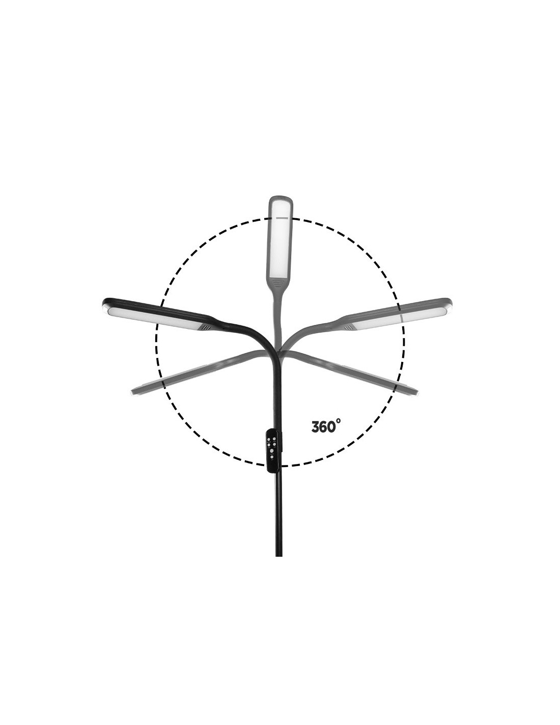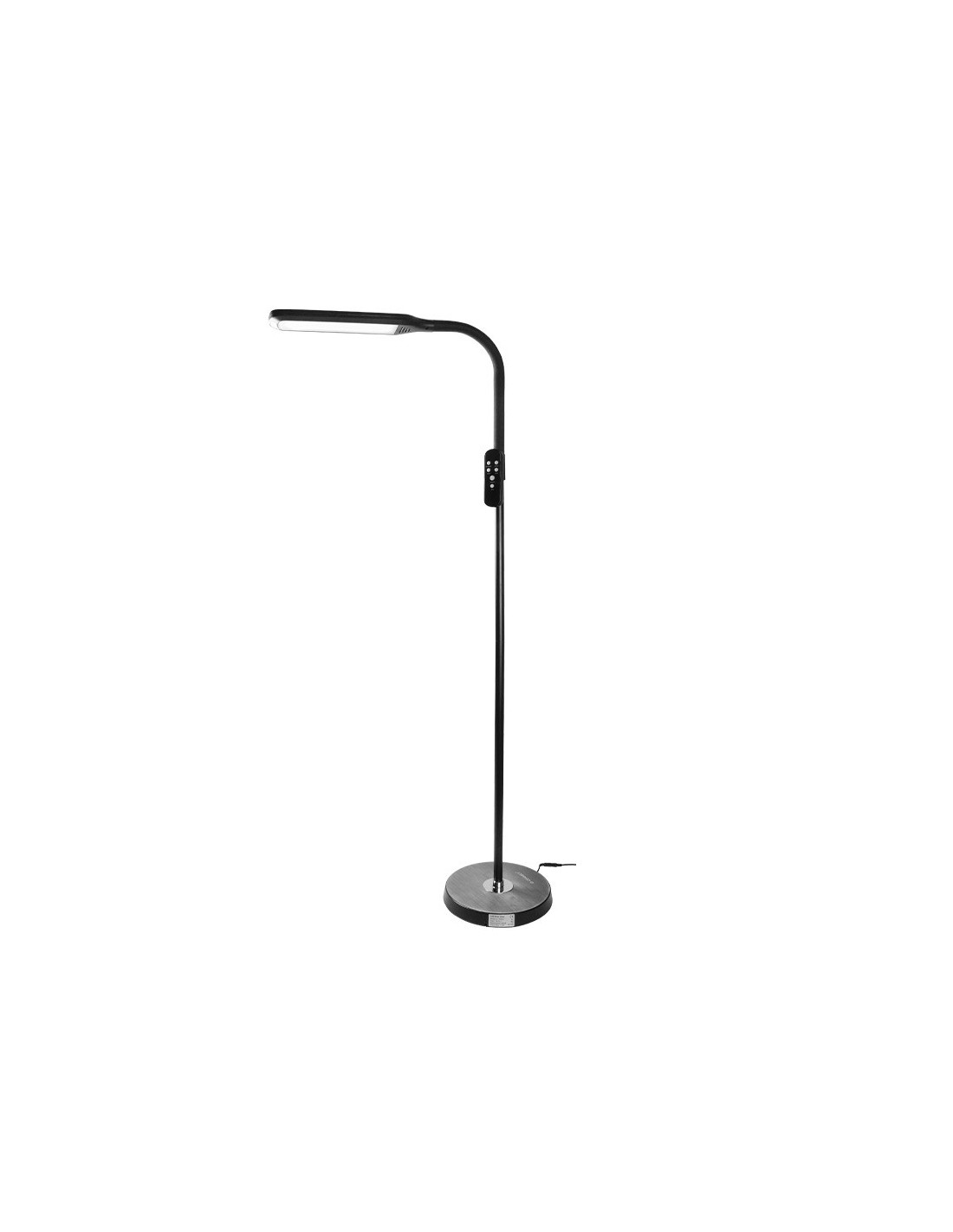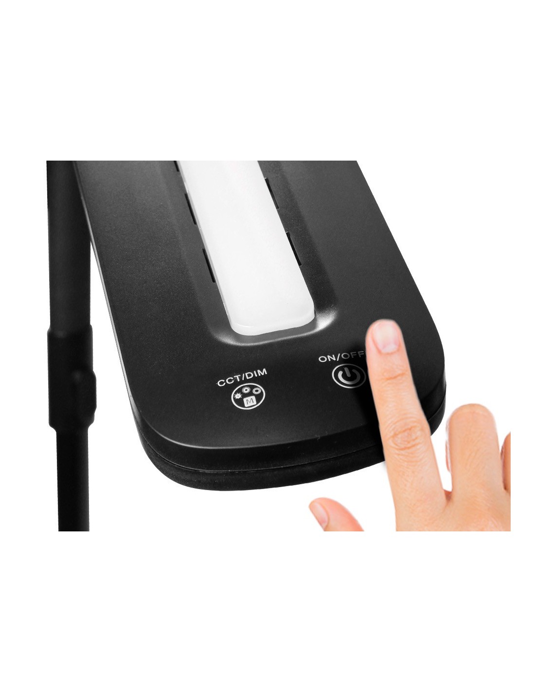 Lámpara de escritorio Q-Connect. Fabricada en ABS con cuello flexible de silicona. Potencia de 15W, 112+48 LEDs y un flujo luminoso de 550 lúmenes. Temperatura de Color: (CCT) ajustable: 3000K (luz cálida), 4100K (luz neutra) y 6300K (luz fría), con un índice de reproducción cromática (CRI) de 80 para una iluminación precisa. Control remoto por infrarrojos para encendido/apagado y regulación de brillo con atenuación contínua. Incluye ganchomagnético para guardar el mando. Cable de 130 mm. Certificados CE y RoHS. Medidas: 272x650x1460 mm. Peso: 3.780 gramos. Color: negro.