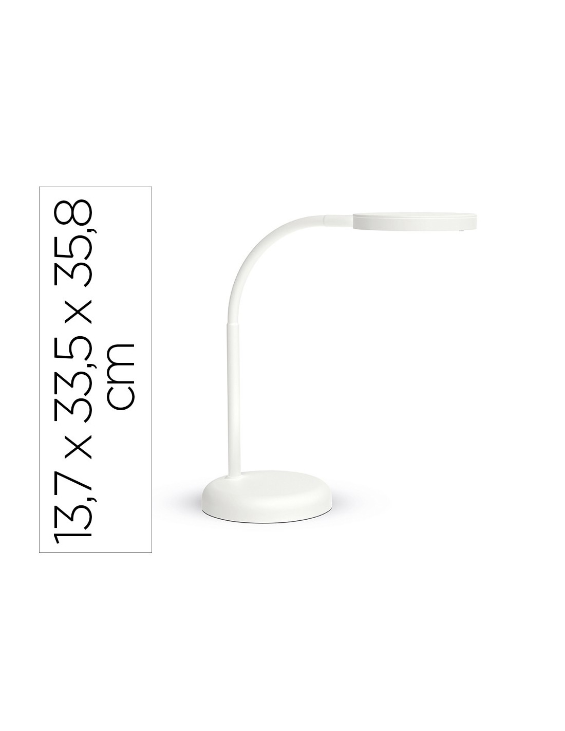 Lámpara de escritorio MAUL. LED. Fabricada en plástico. Potencia de 5W y un flujo luminoso de 769 lúmenes. Temperatura de color fija de 3.000K (luz cálida), con un índice de reproducción cromática (CRI) de 81 para una correcta percepción de los colores. Brazo y cabezal giratorios. Conexión mediante enchufe convencional. Vida útil estimada de 15.000 horas. Longitud de cable 1.800 mm. Medidas: 260x137x335 mm. Peso: 810 gramos. Color blanco.