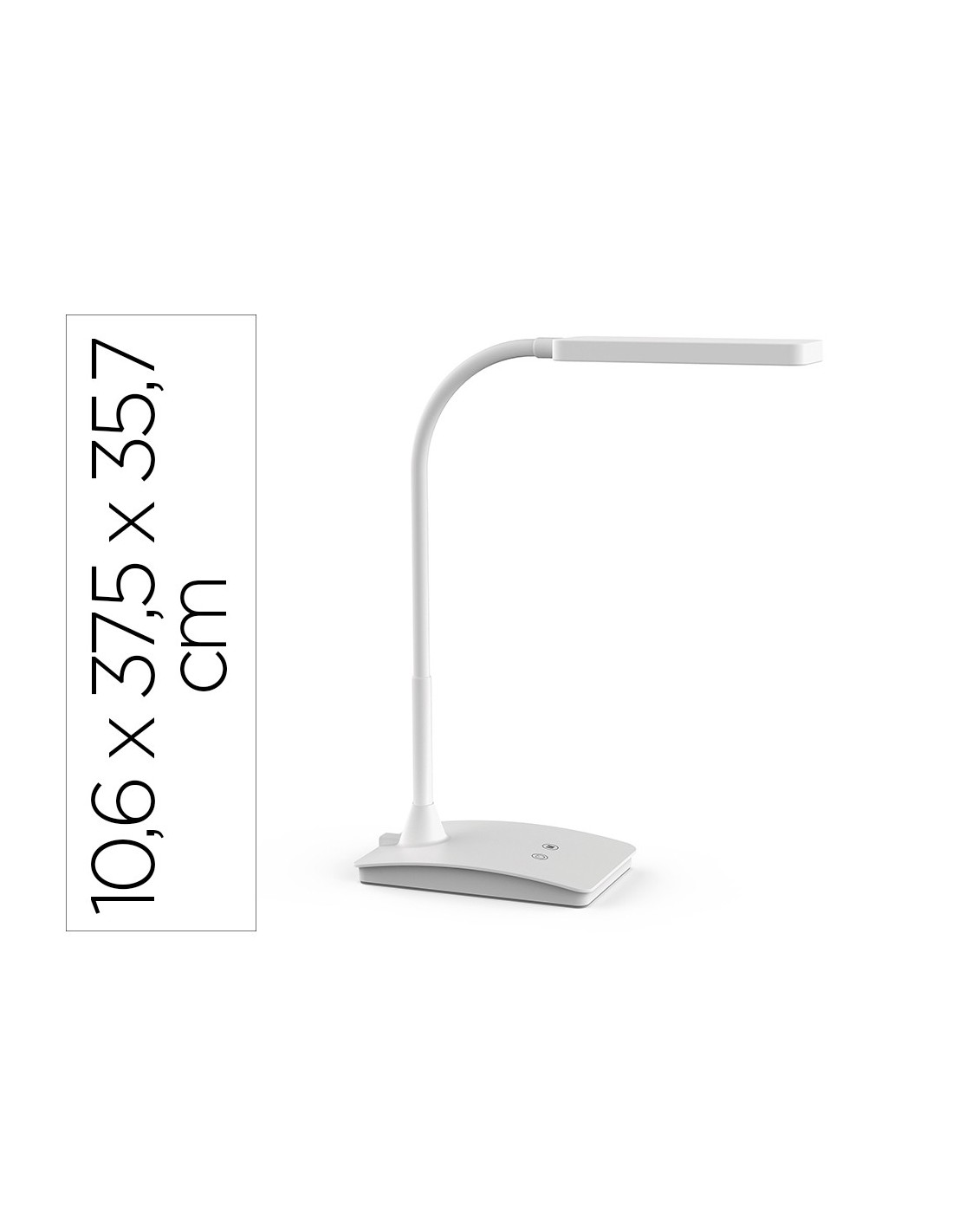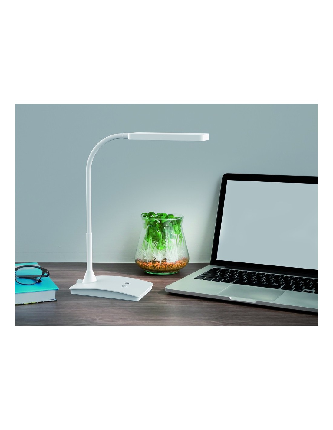 Lámpara de escritorio MAUL. LED. Fabricada en plástico. Potencia de 5W y un flujo luminoso de 616 lúmenes. Temperatura de color ajustable entre 3.000K (luz cálida) y 6.500K (luz fría), con un índice de reproducción cromática (CRI) de 83 para una correcta percepción de los colores. Panel táctil para ajustar el color, doble brazo y cabezal giratorios y regulador de intensidad para ajustar el brillo.. Conexión mediante enchufe convencional. Vida útil estimada de 50.000 horas. Longitud de cable 1.700 mm. Medidas: 265x106x375 mm. Peso: 670 gramos. Color blanco.