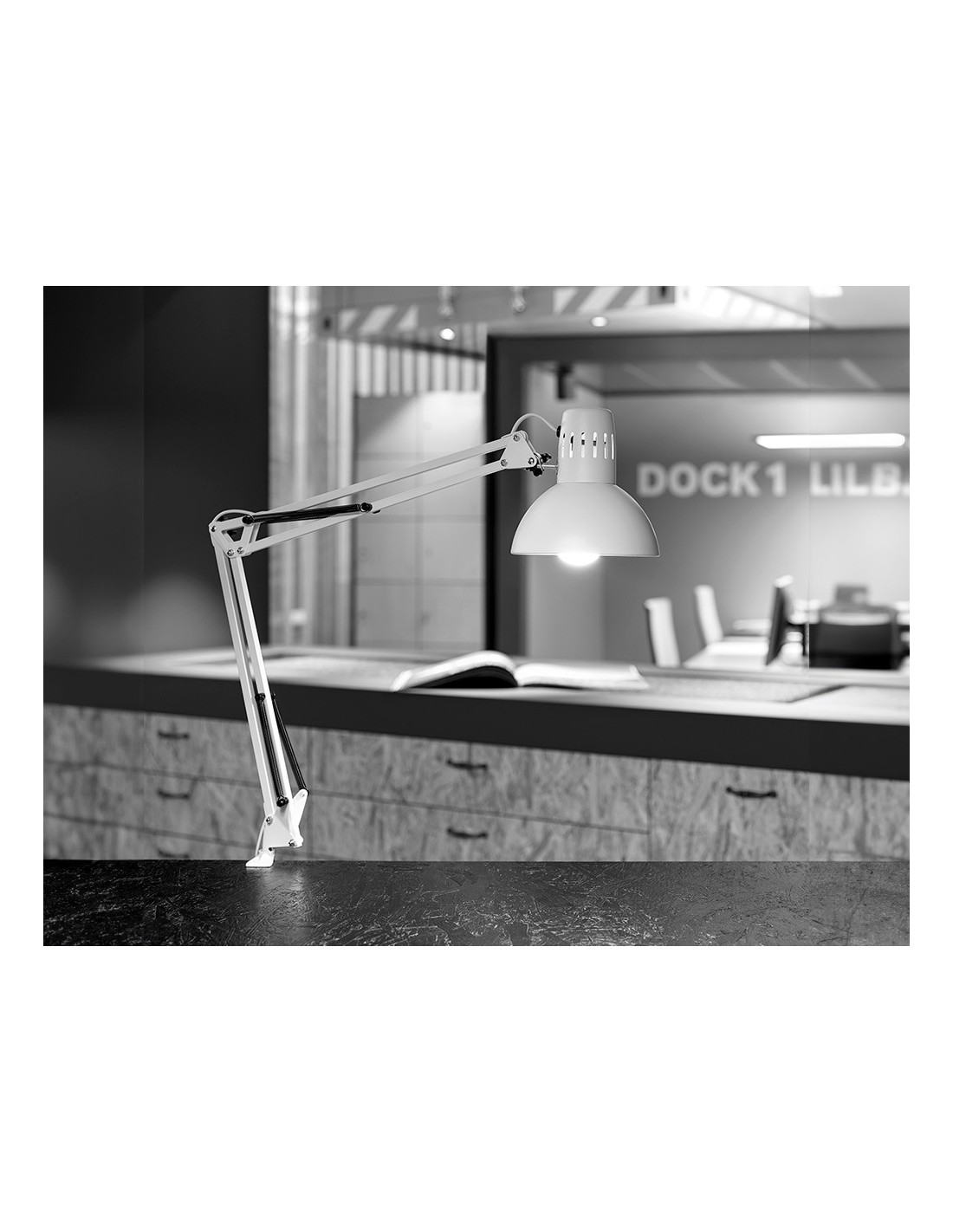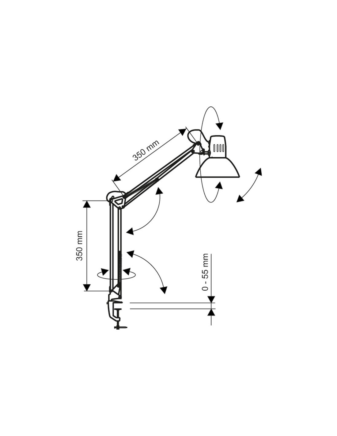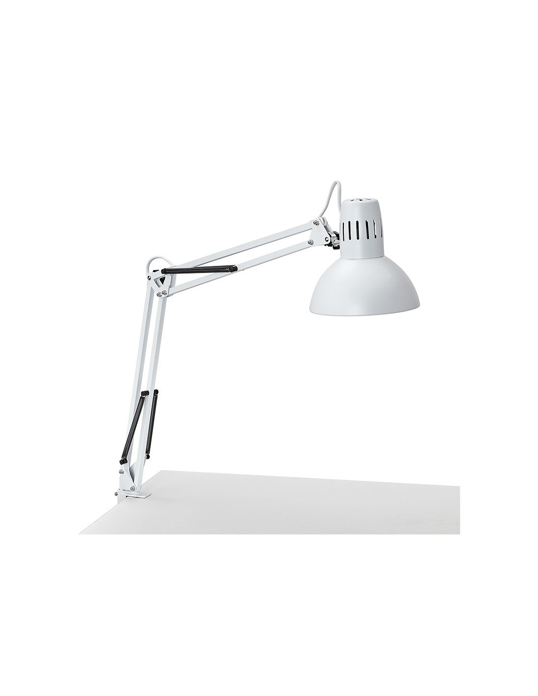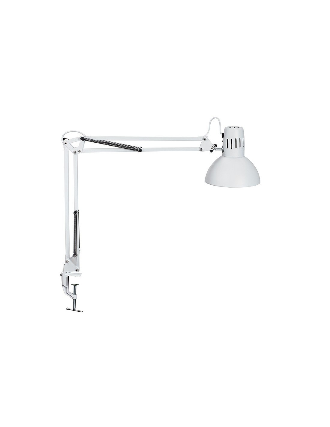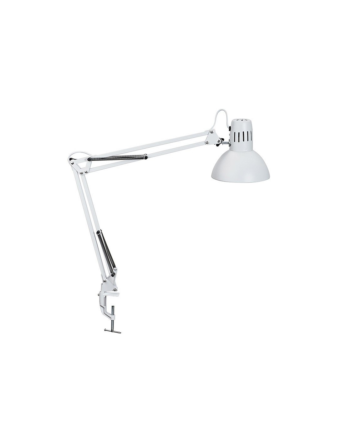 Lámpara de escritorio MAUL. Fabricada en metal. Potencia de 57W. Diseño funcional con doble brazo y cabezal giratorios, con 2 articulaciones que permiten ajustar el ángulo de iluminación con precisión. Incluye pinza para mayor sujeción. Conexión mediante enchufe convencional. Longitud del cable 1.800 mm. Medidas 595x170x440 mm. Peso 810 gramos. Color blanco.