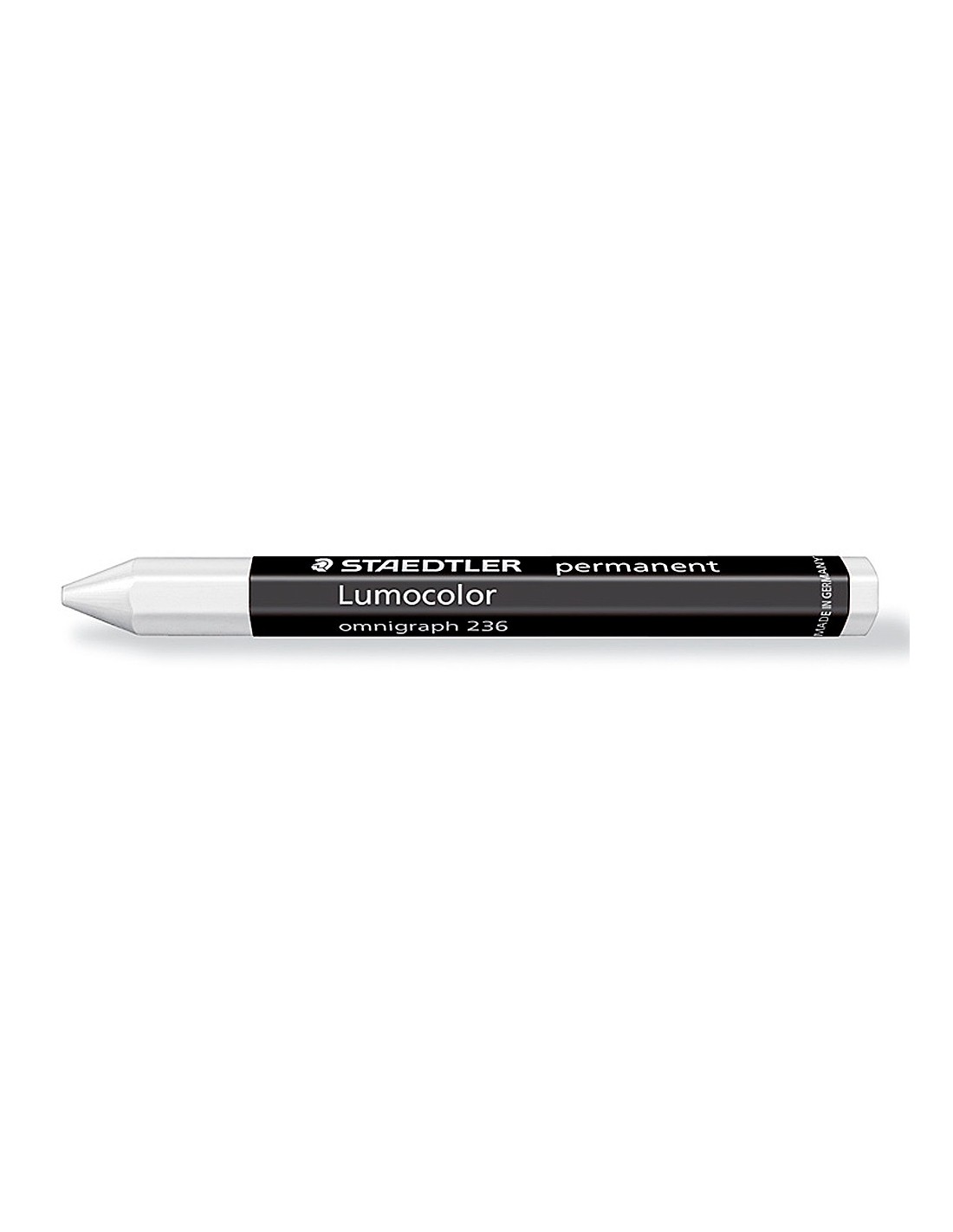 Mina en cera, para el marcado opaco y permanente en casi todas las superficies: papel, plástico, metal, cristal, madera, piel y piedra, incluso se puede aplicar sobre madera mojada. Resistente al agua. No traspasa el papel. Pigmentos de color no corrosivos. Color blanco. Forma hexagonal. Caja de 12 unidades. Longitud: 113 mm. Diámetro: 12 mm.