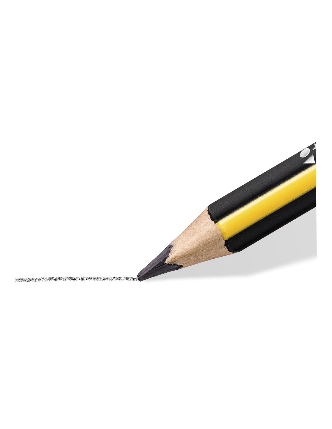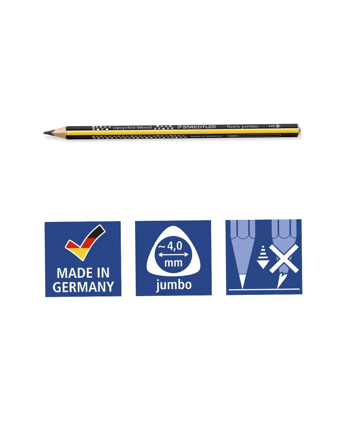 Fomenta la posición correcta de la mano al escribir. Mina blanda de 4 mm. Especialmente resistente a la rotura, soportando grandes presiones. Lápiz ecológico, con madera certificada. Dureza: HB.