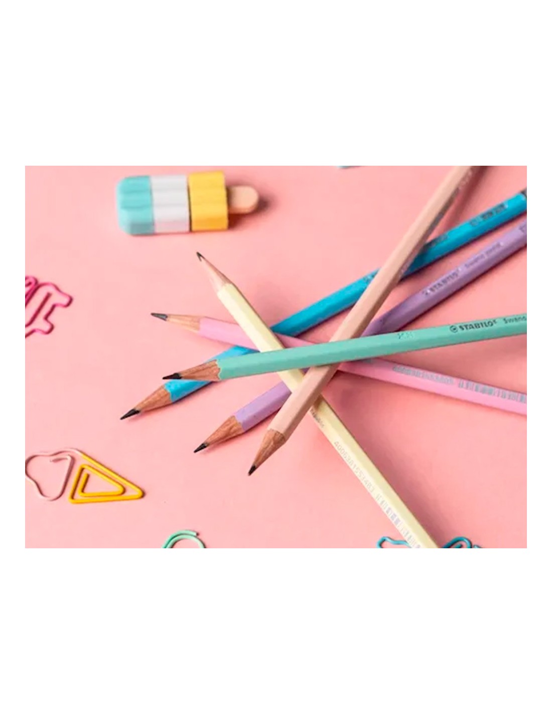Lápiz de grafito con goma STABILO Swano Pastel. Dureza HB (media suave) esperfecta para escribir y dibujar ya sea en la escuela, la universidad o l a oficina. Disponible en 6 colores pastel de moda. Calidad STABILO.