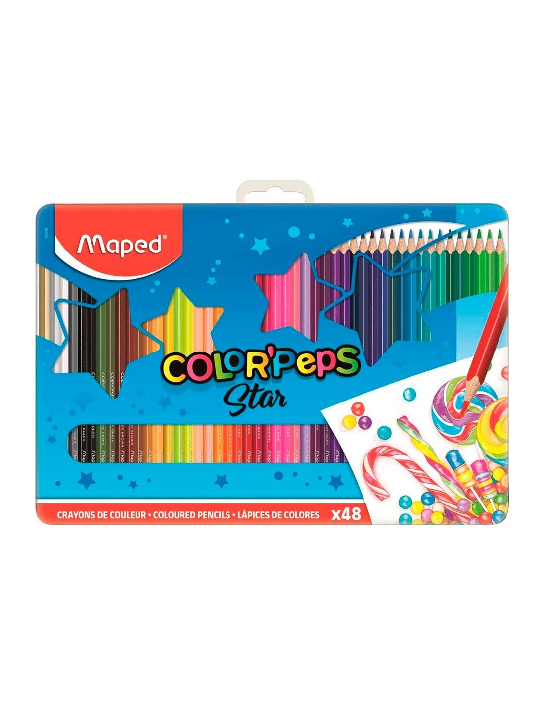 Lápices de colores triangulares color peps. Colores brillantes. Caja metálica de 48 lápices en colores surtidos. Altura del lápiz: 175 mm. Diámetro del lápiz: 7 mm. Mina de 2,9 mm.