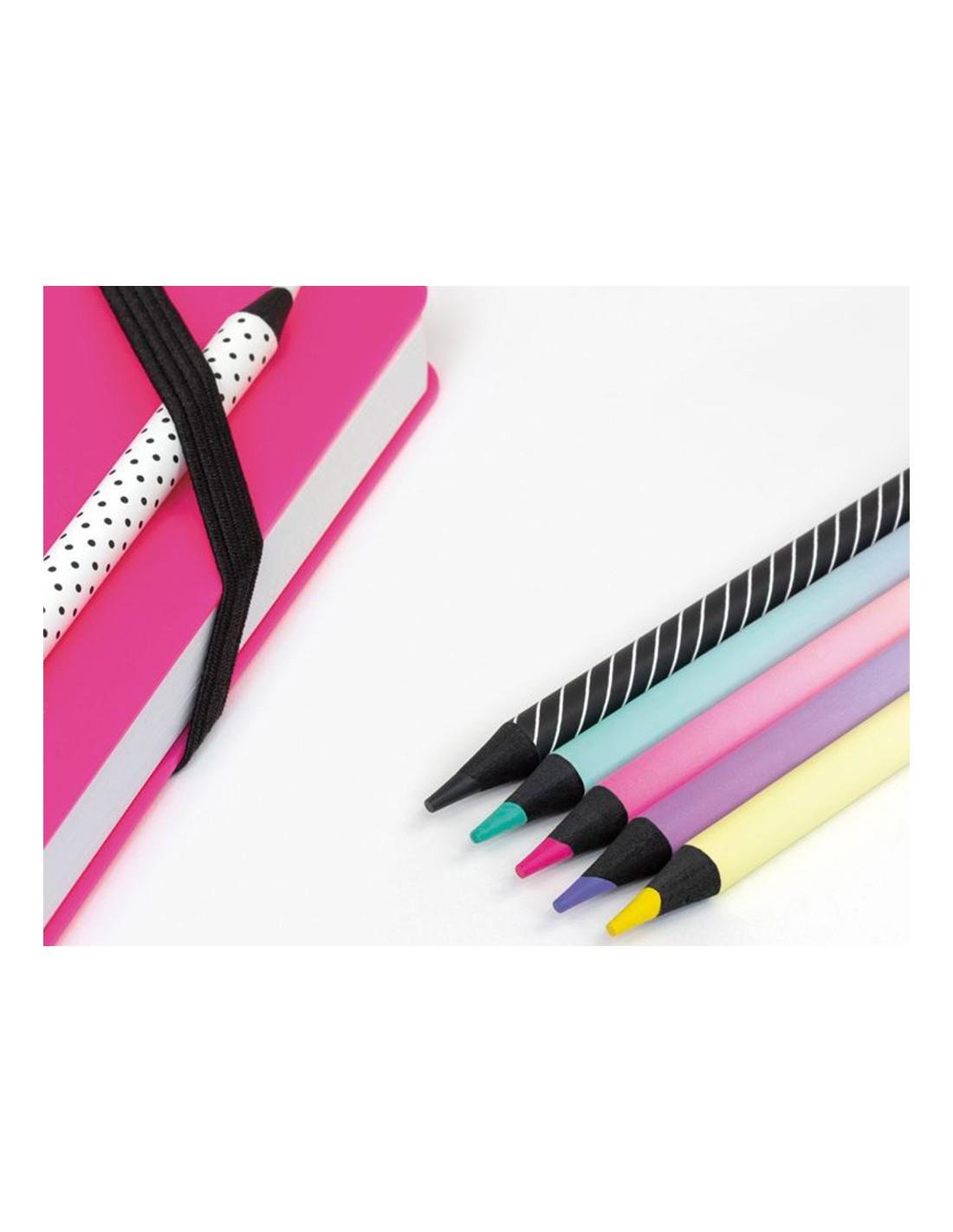 Lápices de colores con mina gruesa de 3,5 mm. Fabricados en madera negra de tilo. Cuerpo redondo. Mina resistente a la rotura. Madera procedente de plantaciones sostenibles. 6 colores: blanco, amarillo, lila, rosa, turquesa y negro.