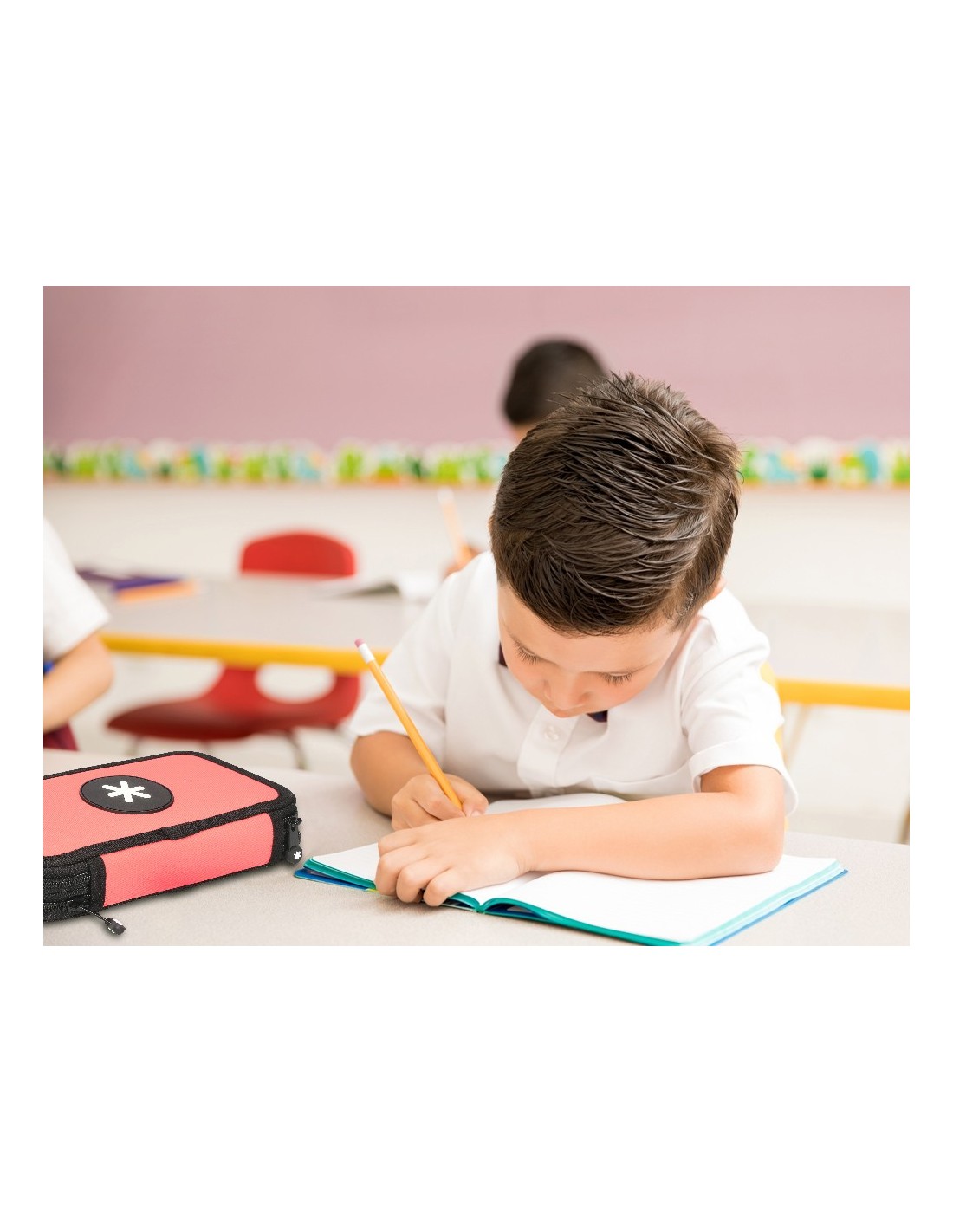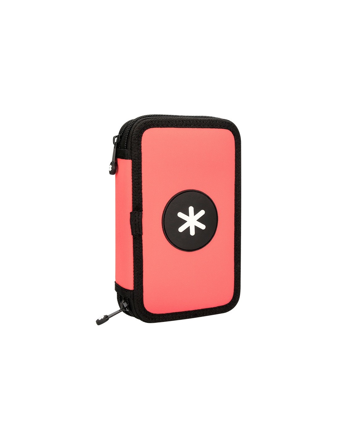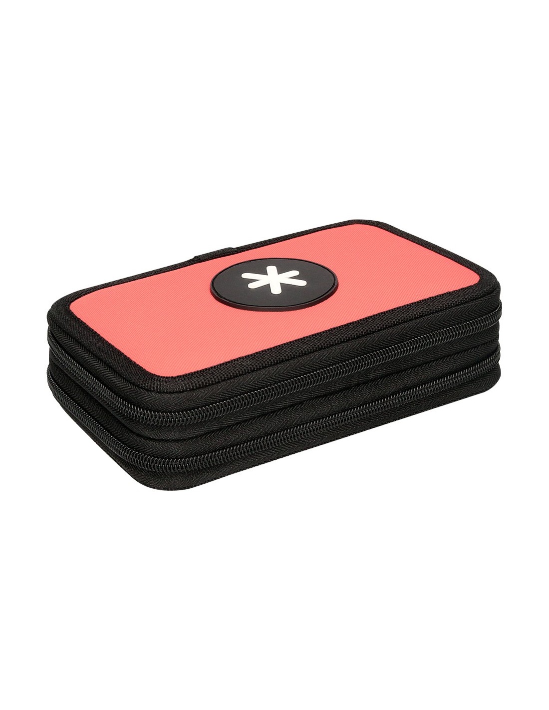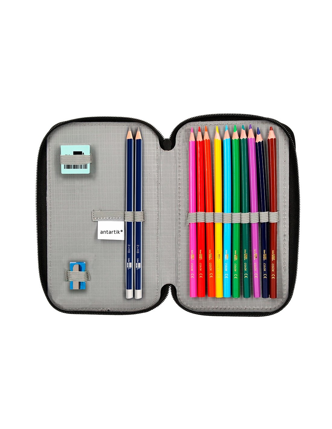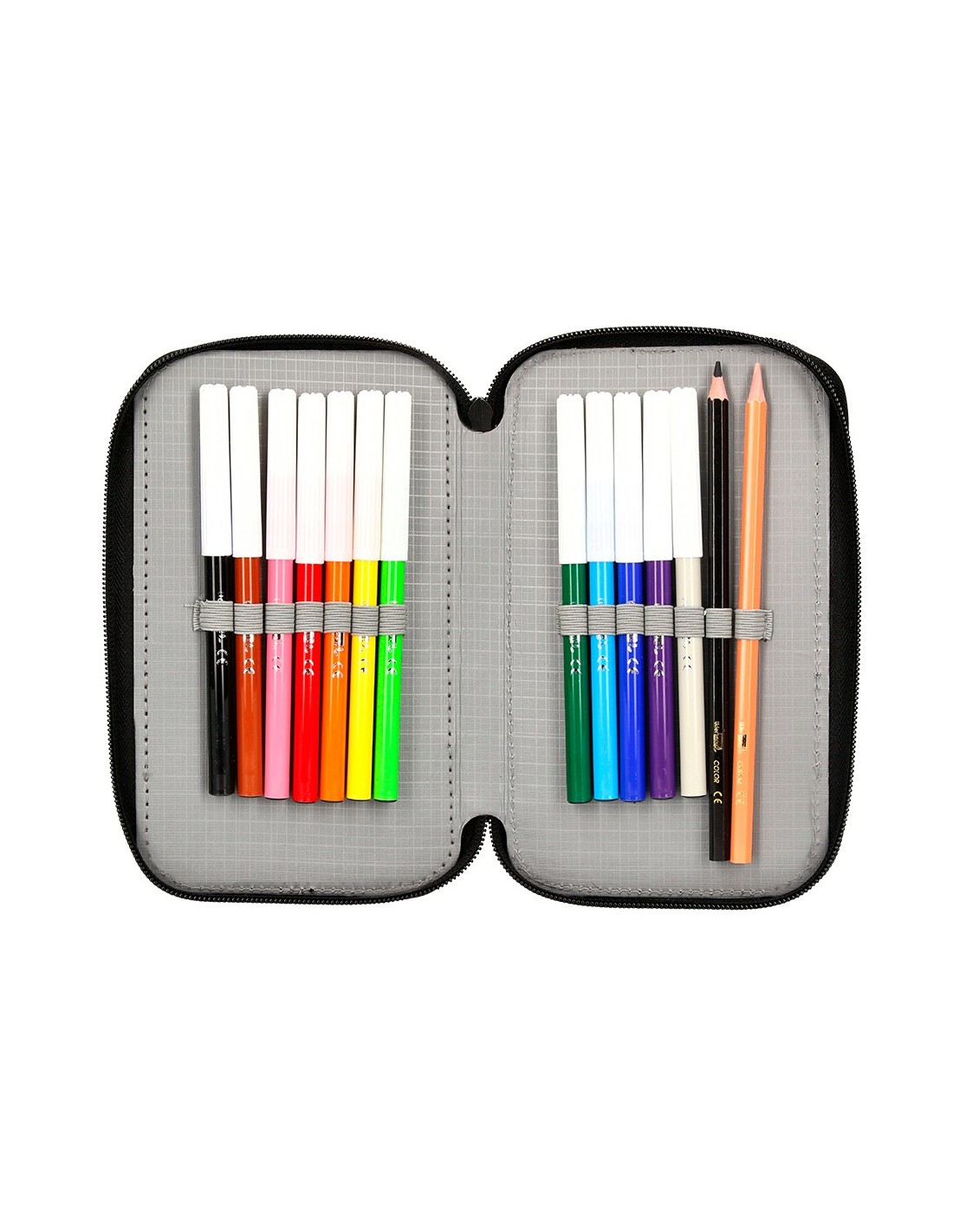 Plumier de tela alta calidad con 2 cremalleras. Contiene: 12 rotuladores, 12 lápices de colores, 1 sacapuntas, 2 lápices HB y 1 goma. Medidas: 200 x 125 x 45 mm.