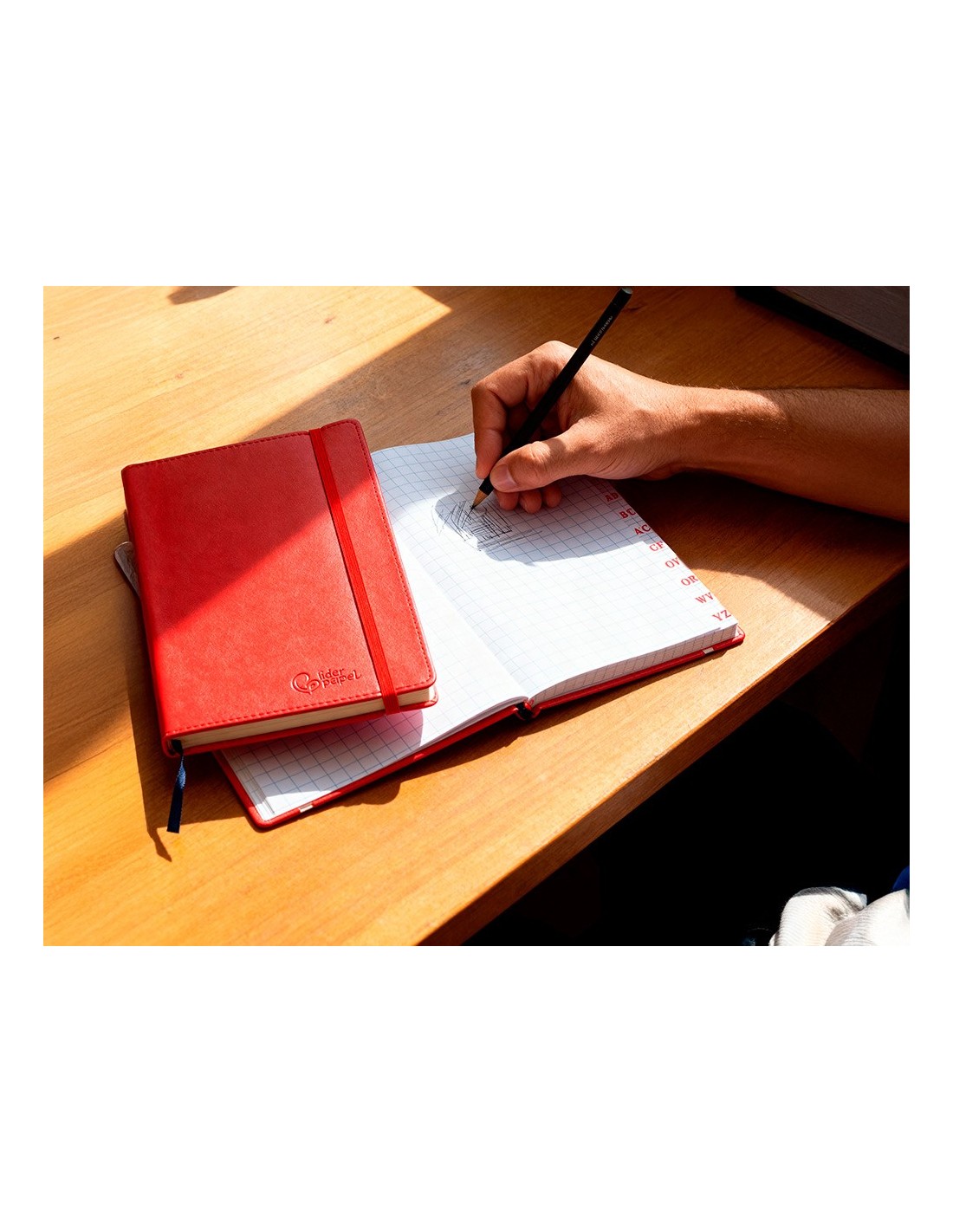 Cuaderno encolado con cierre de gomillas. Perfecta para llevar encima, tomar apuntes, hacer bocetos, plasmar cualquier idea. Tapa símil-piel flexible de 1,75 mm de espesor. 120 hojas. 70 g/m². Sin margen.