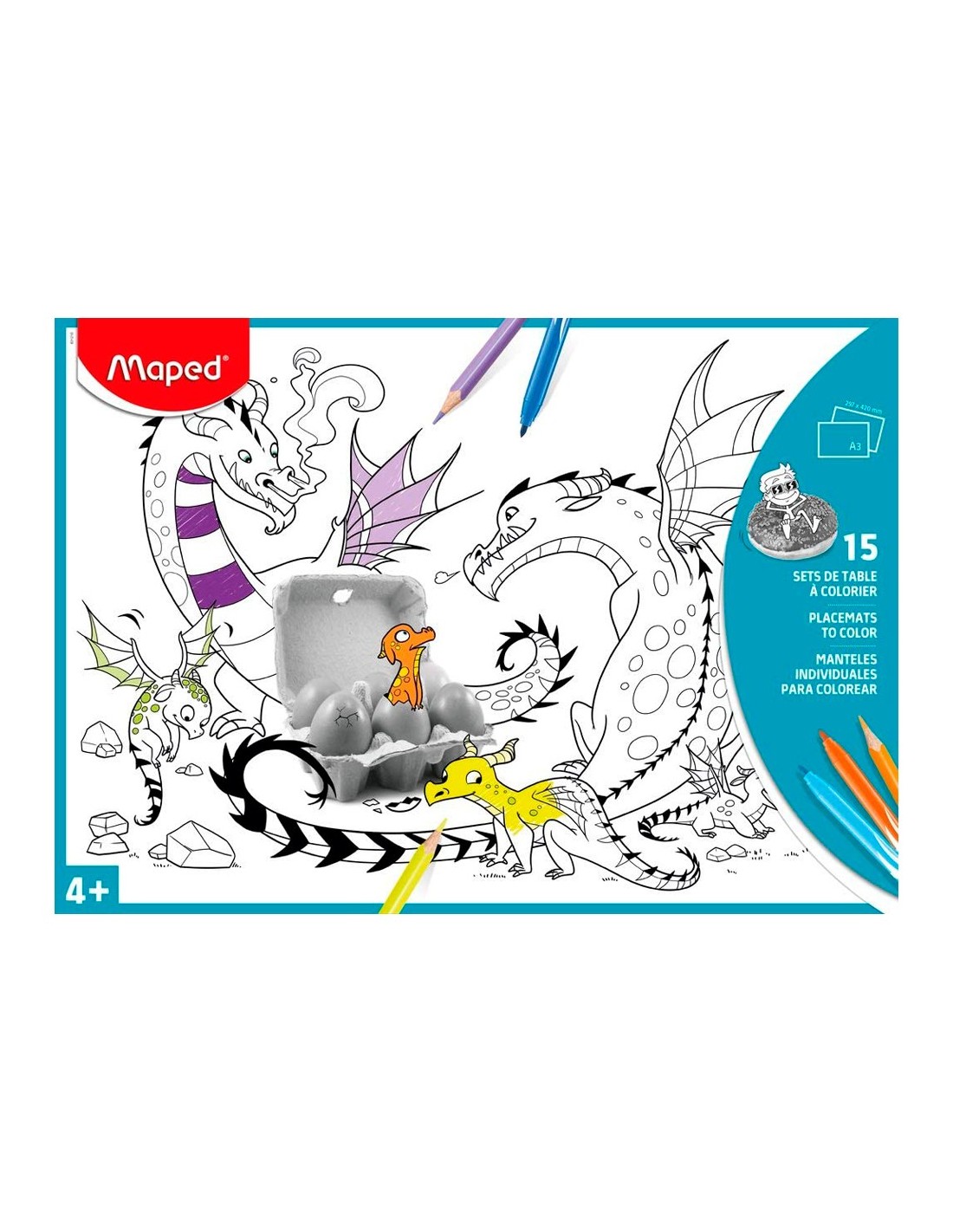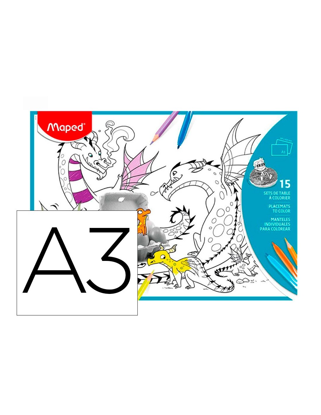 15 láminas para colorear con ilustraciones y fotografías reales. Perfecto para el entretenimiento de los niños o fiestas de cumpleaños. Sirve como mantel individual. Medidas: 42 x 30 cm.