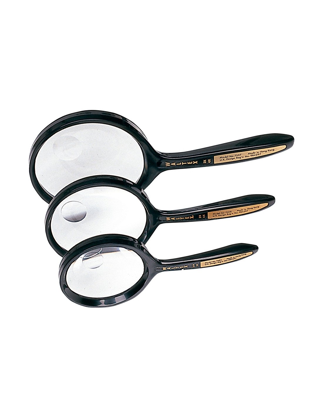 Lupa de lectura con mango curvo y alta precisión. Aro de plástico. 2 y 4 aumentos.