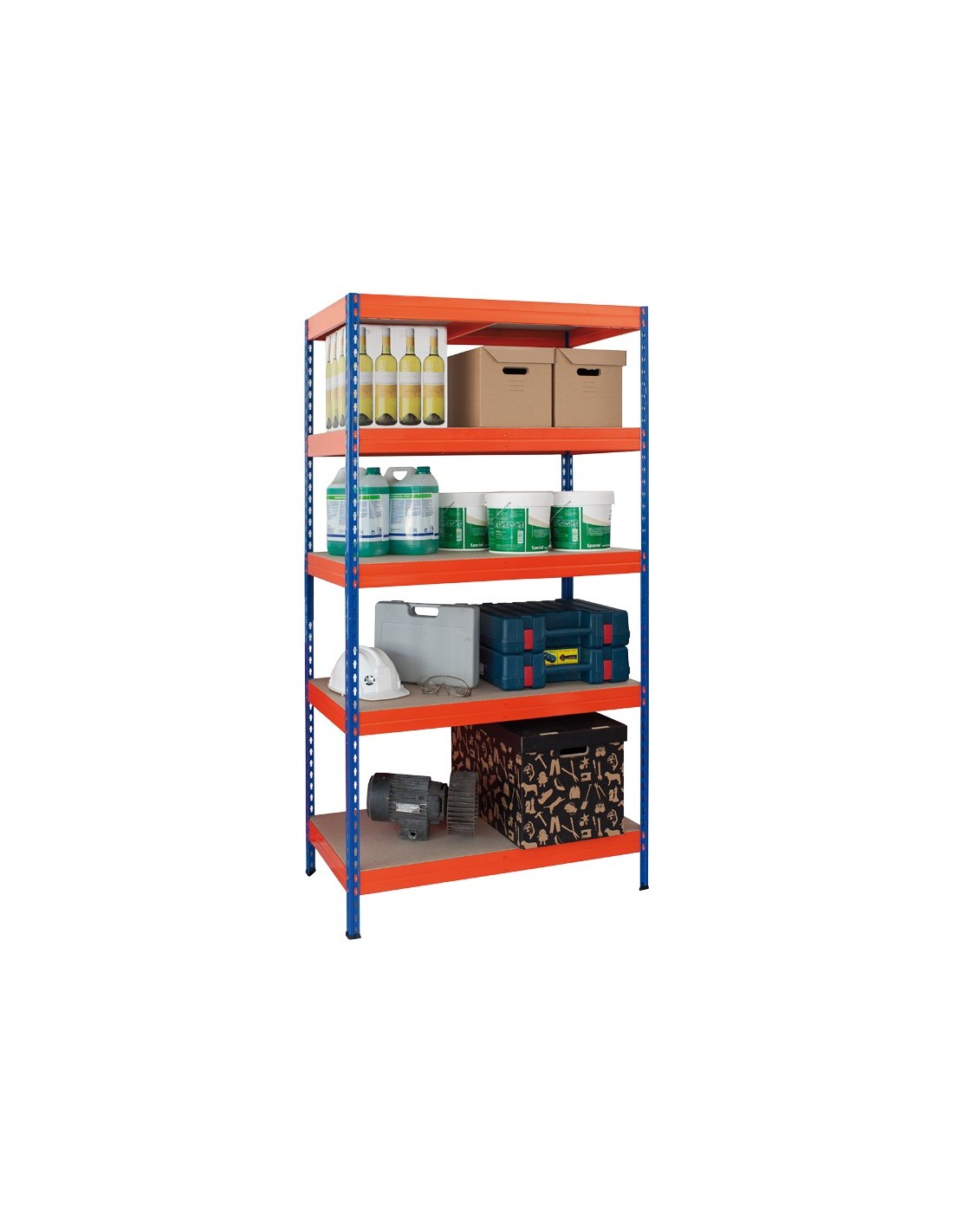 Estantería metálica 5 estantes, 300 kg por estante. Bandejas de madera. Montaje fácil sin tornillos por simple encaje. Color azul/naranja. Medidas: 100 x 192 x 50 cm.