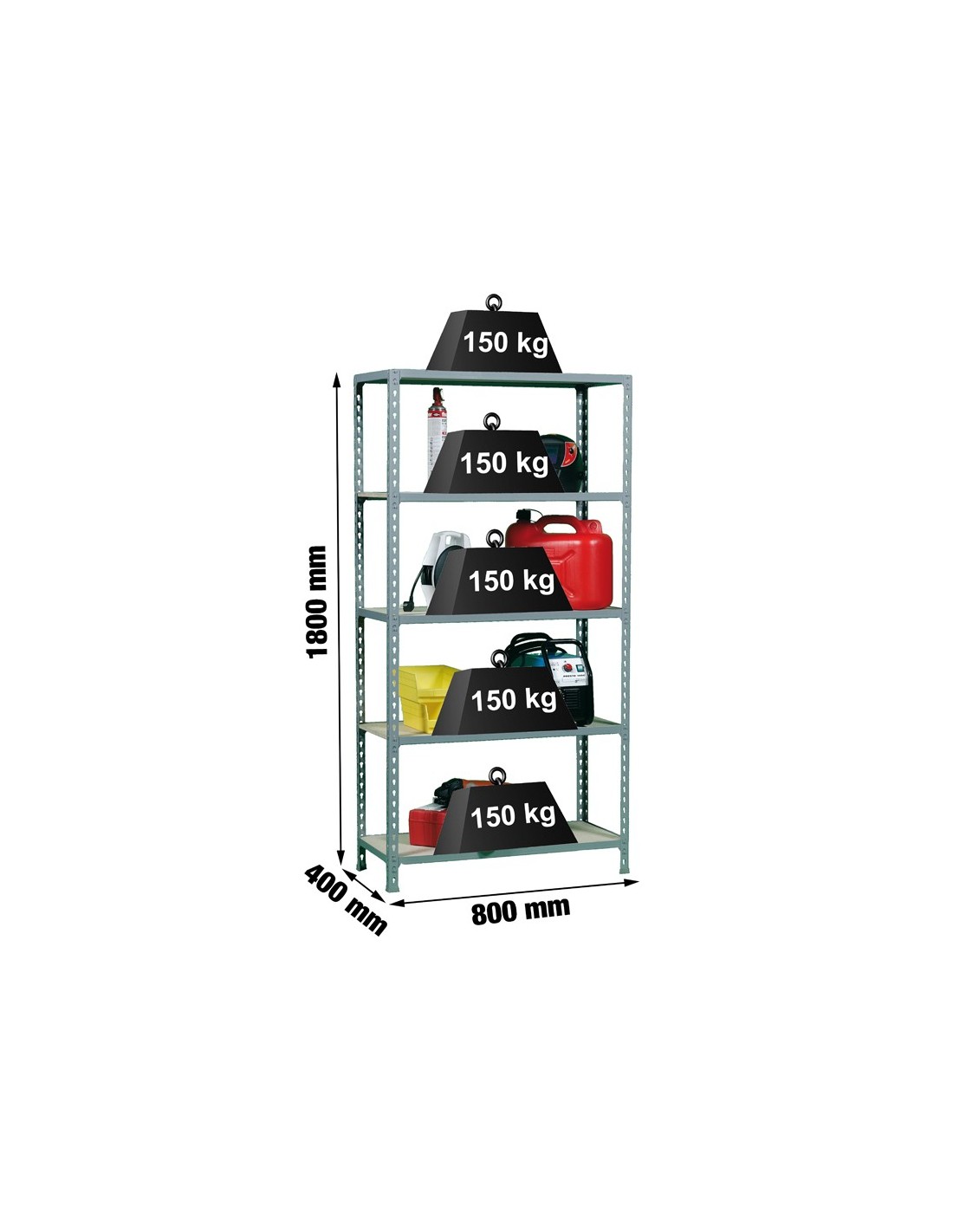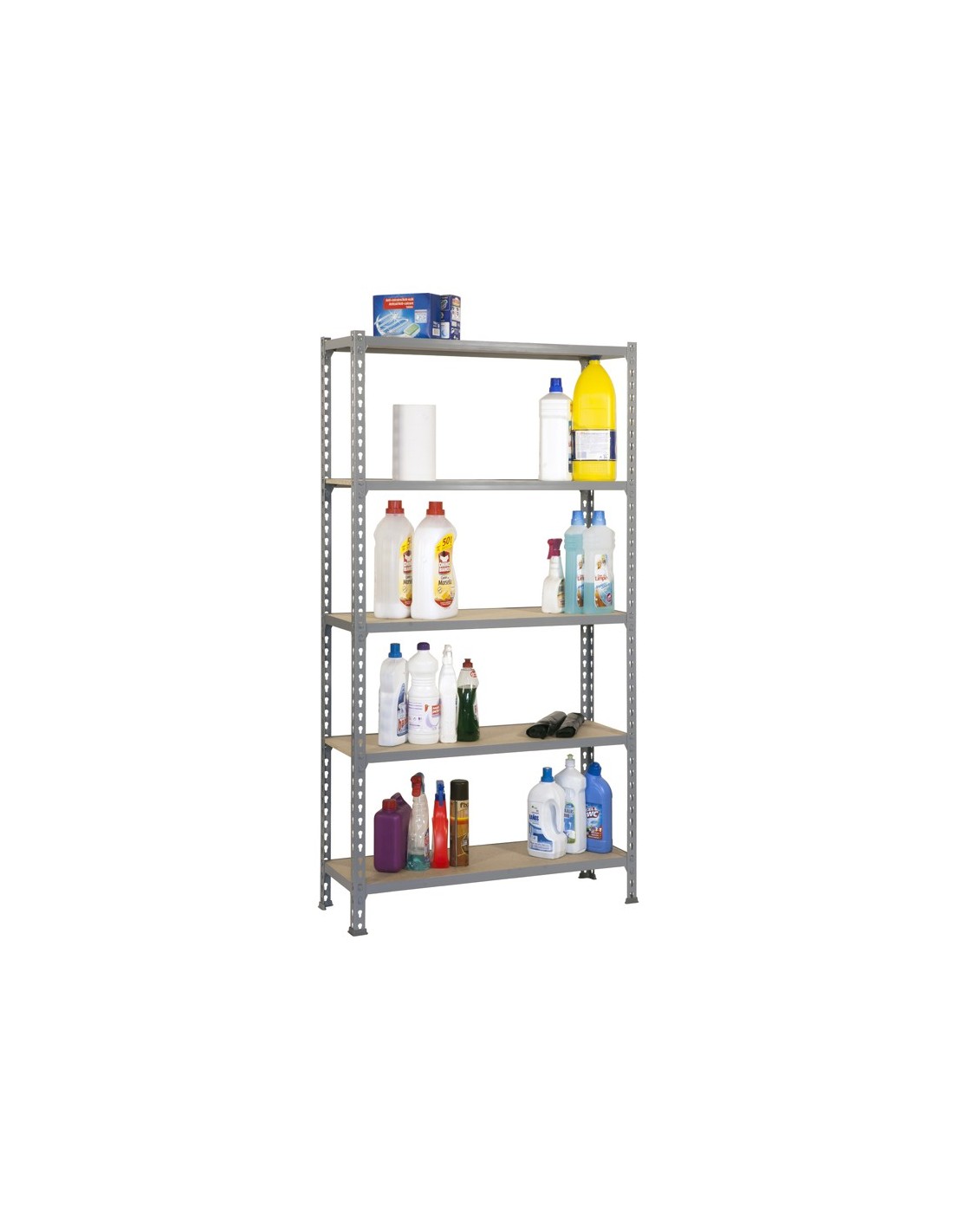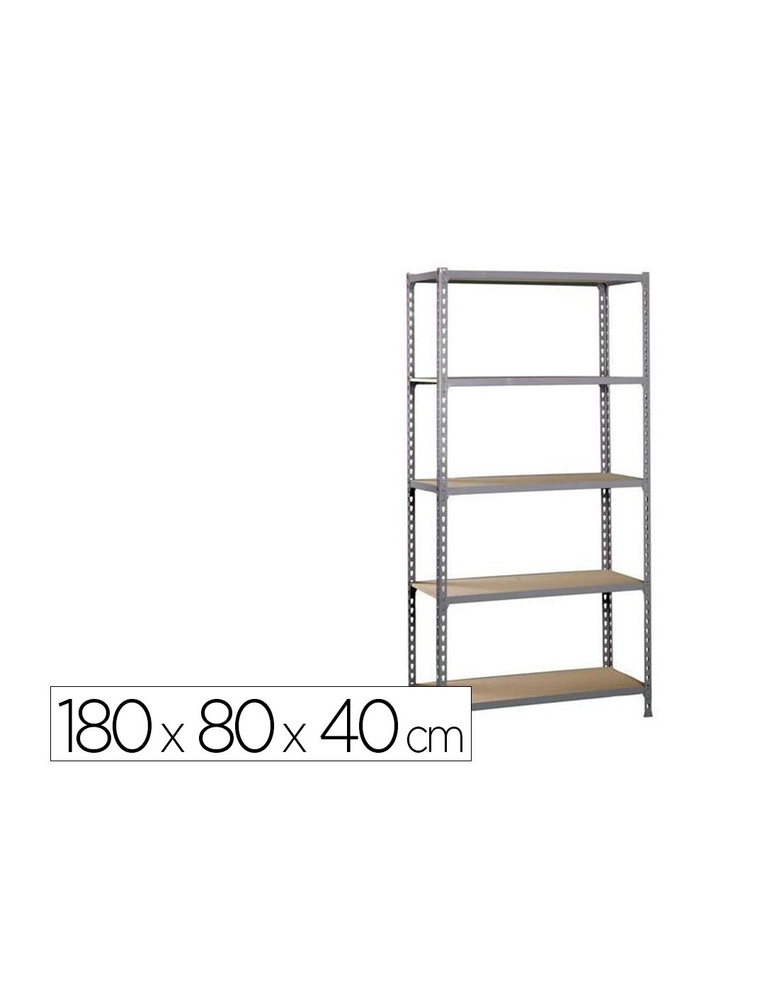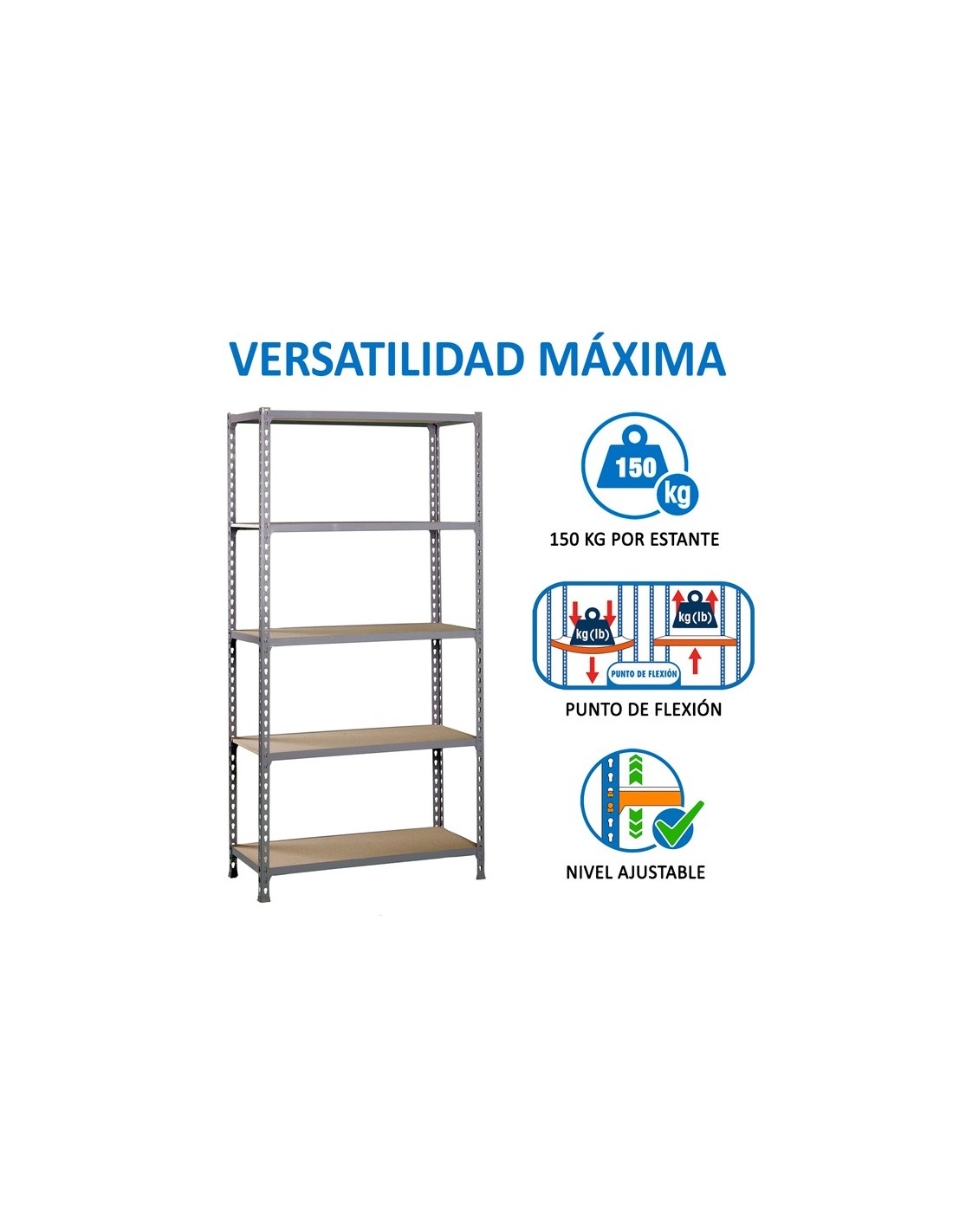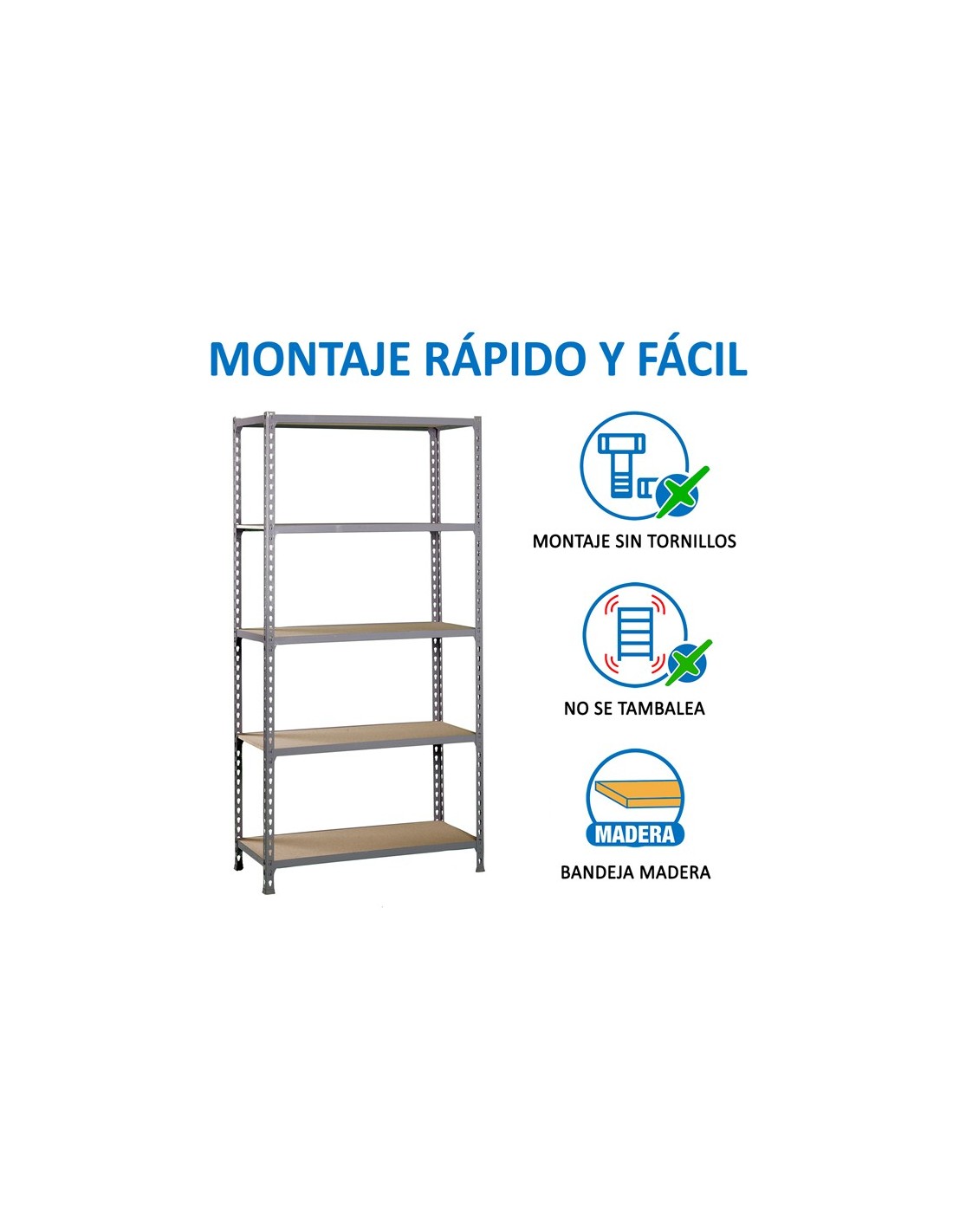 Estantería metálica sin tornillos de color gris/madera. Capacidad de cargapor estante: 150 kg. Número de estantes: 5. Estantes de aglomerado de 12 mm. Producto español de calidad europea. Medidas (alto x ancho x fondo): 1800x800x400 mm.