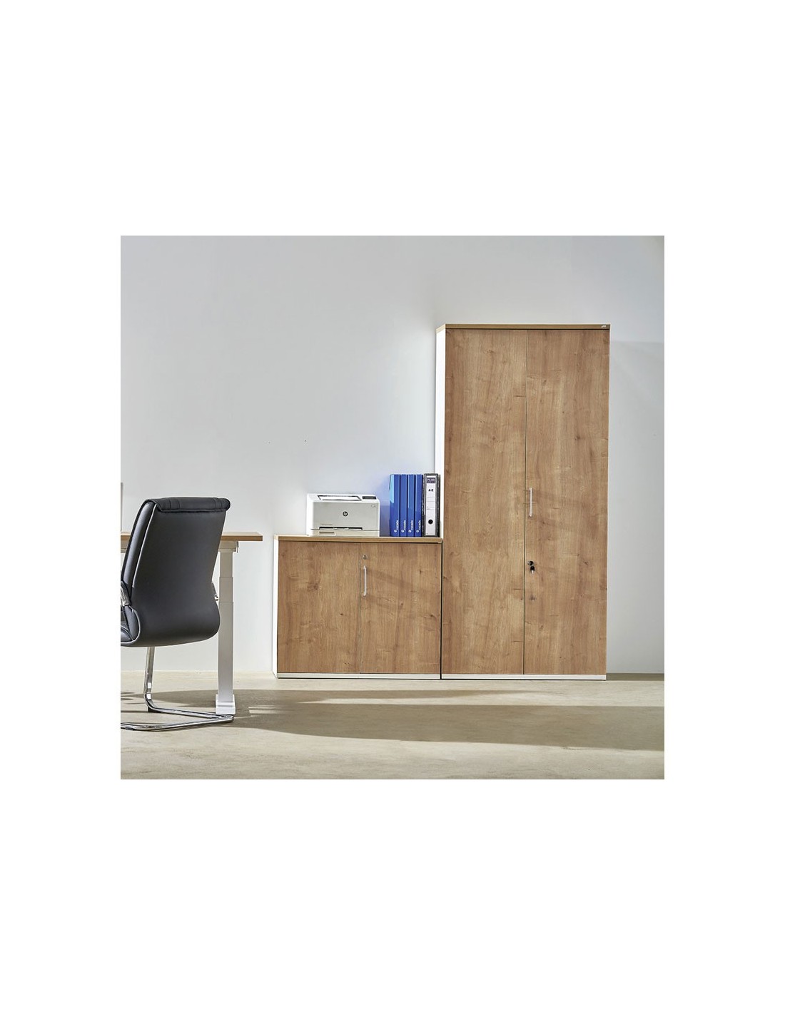 Amplia gama de armarios que gracias a sus suaves líneas rectas, encajan perfectamente con todas nuestras series de mobiliario. Están disponibles en múltiples acabados de color, lo que permite que se adapte a cualquier estilo. Estructura de melamina de 19 mm de grosor, canteada en PVC de 1mm de grosor. La parte trasera esta realizada en DM de 3 mm pintado en color según modelo por ambas caras. Todas la baldas de 25 mm incluidas. Los armarios con puertas batientes van equipados con una cerradura con 2 llaves plegables. Tiradores metálicos con acabado metalizado.