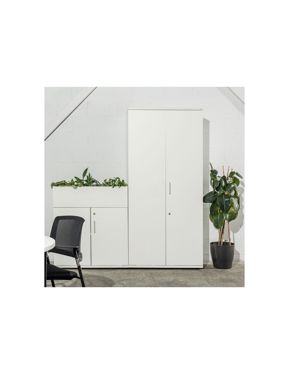 Amplia gama de armarios que gracias a sus suaves líneas rectas, encajan perfectamente con todas nuestras series de mobiliario. Están disponibles en múltiples acabados de color, lo que permite que se adapte a cualquier estilo. Estructura de melamina de 19 mm de grosor, canteada en PVC de 1mm de grosor. La parte trasera esta realizada en DM de 3 mm pintado en color según modelo por ambas caras. Todas la baldas de 25 mm incluidas. Los armarios con puertas batientes van equipados con una cerradura con 2 llaves plegables. Tiradores metálicos con acabado metalizado.