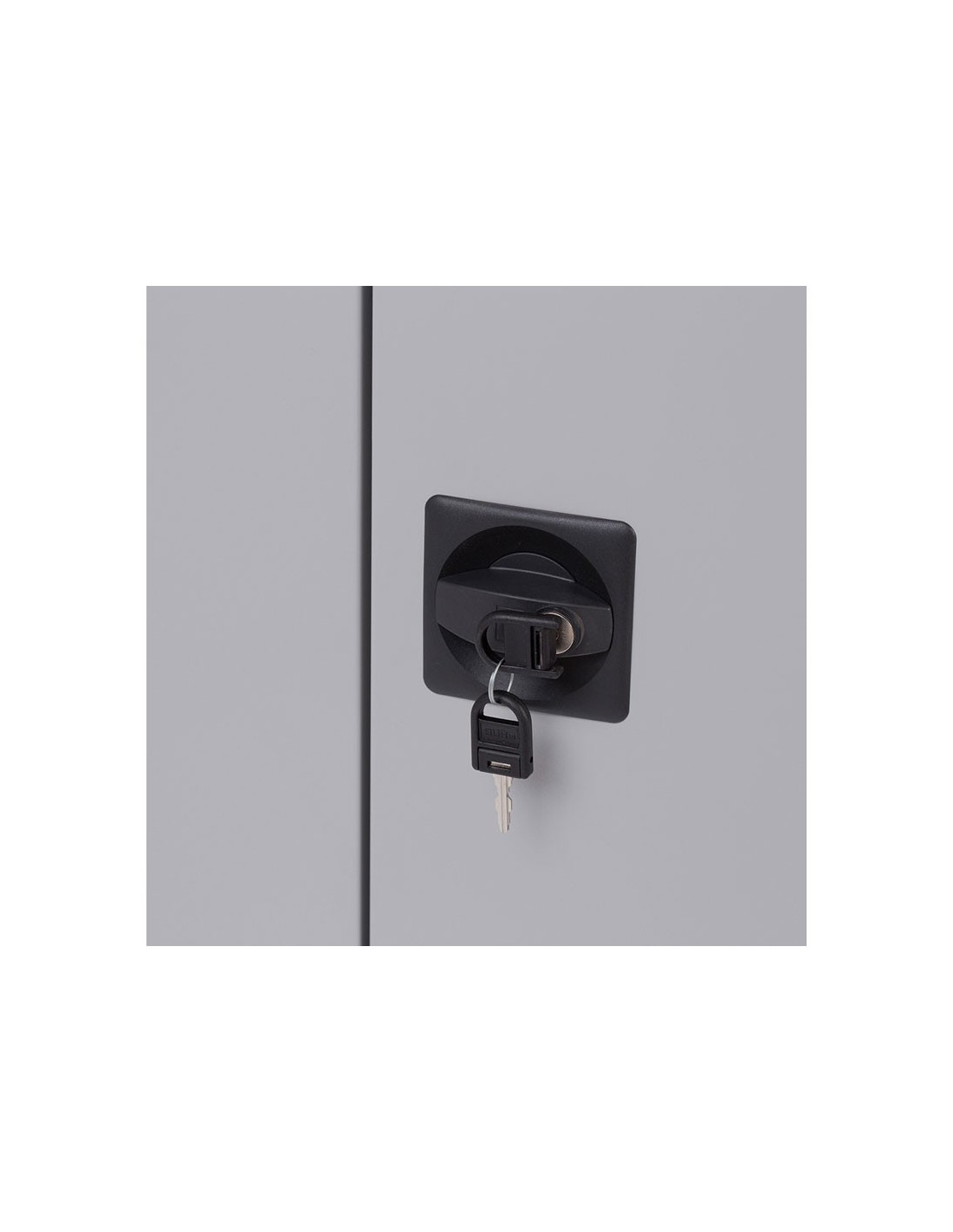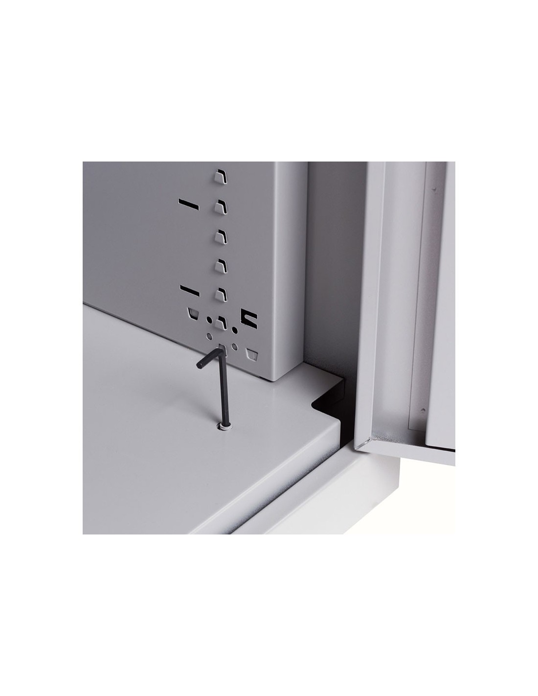 Armarios metálicos con niveladores realizados en plancha de acero. Puertas metálicas de acero de 0.7 mm batientes con refuerzo interior y cerradura de seguridad con tirador incorporado. Baldas metálicas regulables en altura (admiten carpetas colgantes A4). Baldas incluidas.