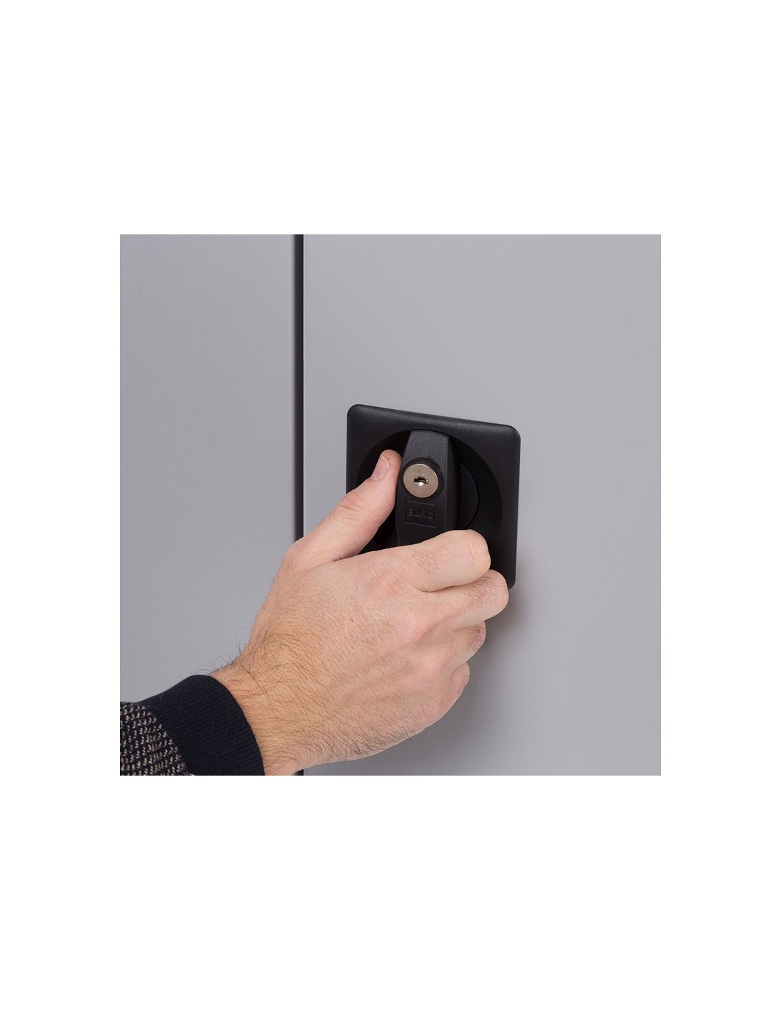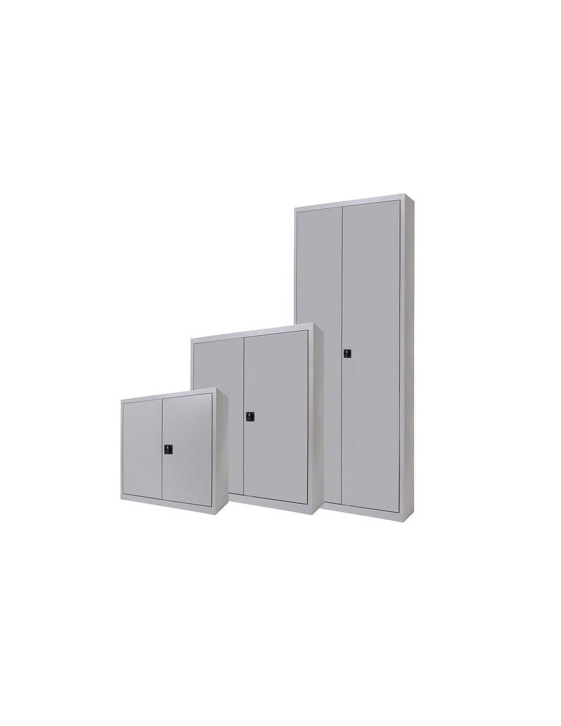 Armarios metálicos con niveladores realizados en plancha de acero. Puertas metálicas de acero de 0.7 mm batientes con refuerzo interior y cerradura de seguridad con tirador incorporado. Baldas metálicas regulables en altura (admiten carpetas colgantes A4). Baldas incluidas.