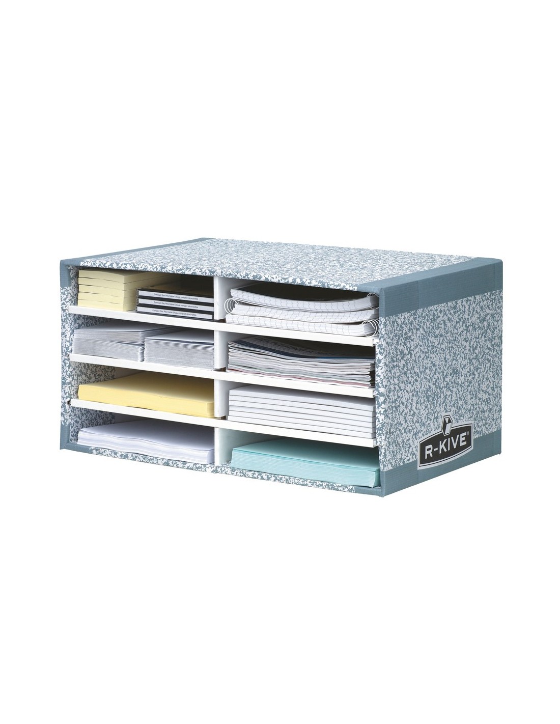 Organizador fabricado en cartón 100% reciclado e impreso con tintas a base de agua. 100% reciclable. Ocho casilleros para organizar documentos, correo y otros productos de escritorio. En la parte frontal se pueden incluir etiquetas. Apilable hasta tres alturas para ahorrar espacio. Medidas compartimento: 23 x 5,5 x 31 cm. Medidas del módulo: 49 x 26 x 31 cm. Se entrega sin montar.