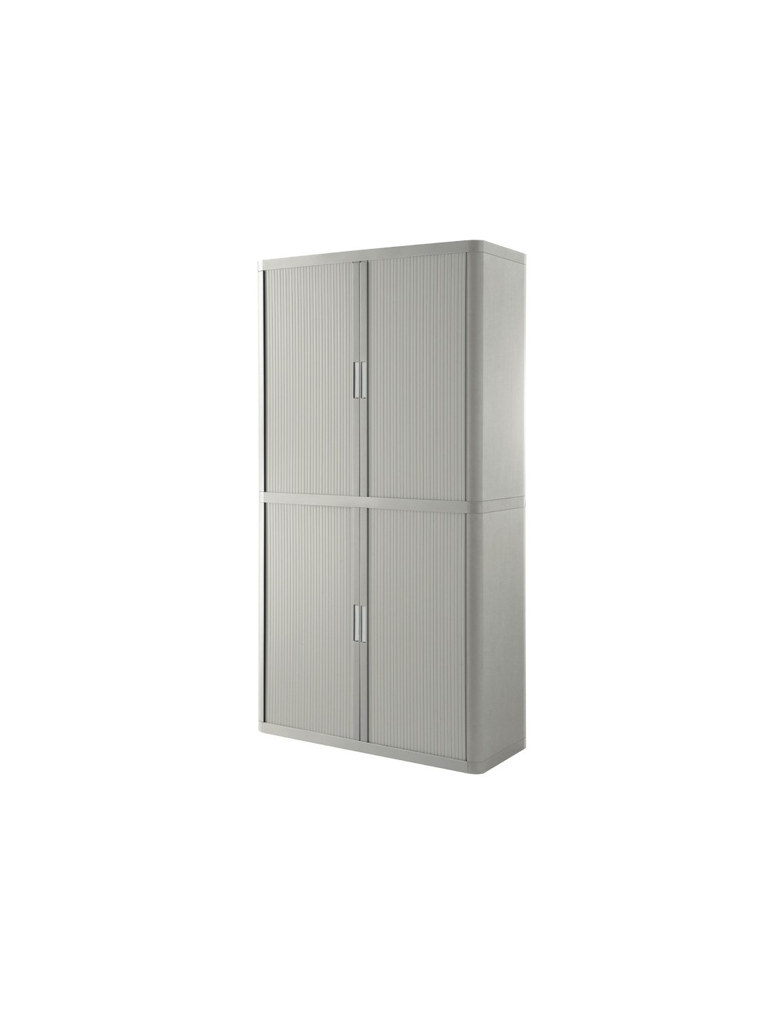 Armario de fácil montaje. Estructura en un 25% acero y un 75% poliestileno. Puertas correderas en polipropileno de 8 mm. Asas y cerraduras con dos llaves incluidas. Capacidad para 9 archivadores de palanca. Cerradura con tapa plegable para ocultarla.