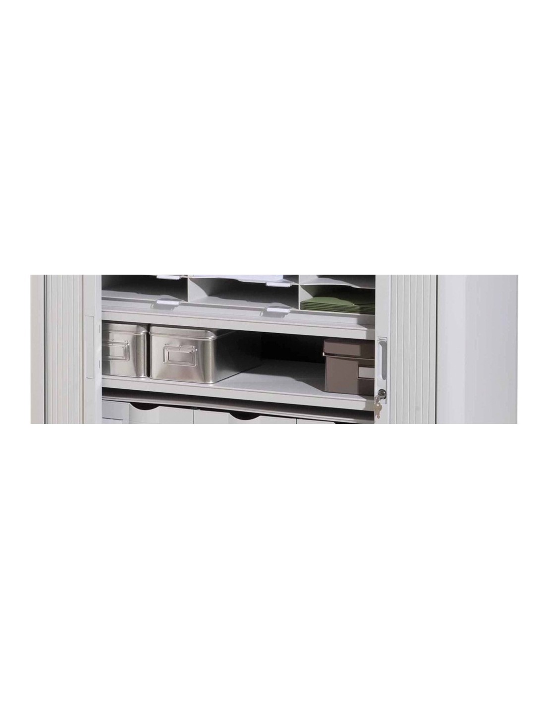 Armario de fácil montaje. Estructura en un 25% acero y un 75% poliestileno. Puertas correderas en polipropileno de 8 mm. Asas y cerraduras con dos llaves incluidas. Capacidad para 9 archivadores de palanca. Cerradura con tapa plegable para ocultarla.