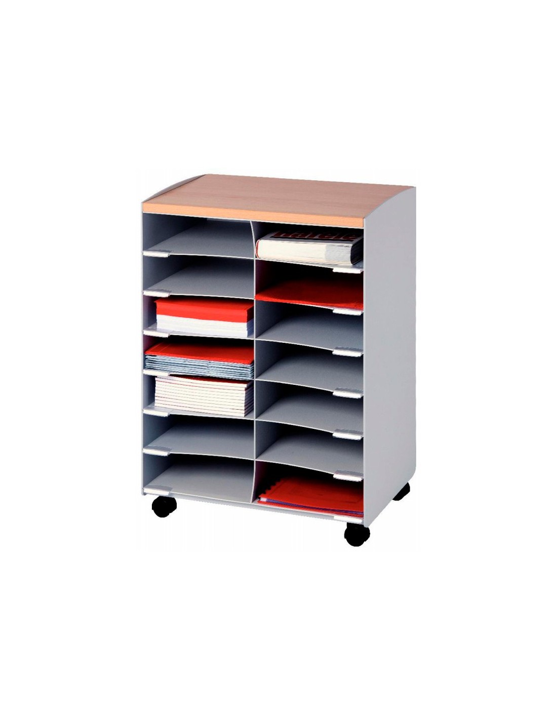 Mueble con ruedas multiuso de 14 casillas. Color haya y gris. Estructura y casillas de poliestireno. Acabado superior de panel de partículas de melamina decorado haya. Alta resistencia: aguanta hasta 60 kg en la parte superior y 3 kg por casilla. Medidas de las casillas: 25 x 8,5 x 32,1 cm. Medidas: 51,4 x 72 x 33 cm.