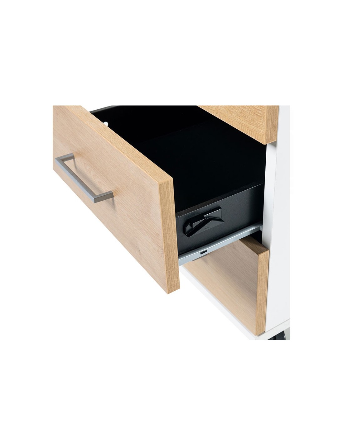 Estructura realizada en melamina de 19 mm en su totalidad, incluido trasera. Las 4 ruedas disponen de sistema de freno para la correcta fijación. Cerradura con 2 llaves plegables. Sistema de cierre centralizado para la confidencialidad deseada. Sistema antivuelco incorporado para una máxima seguridad. Tiradores metálicos con acabado metalizado. Cajones metálicos realizados en chapa de acero. Guías metálicas con rodamientos de Nylon.