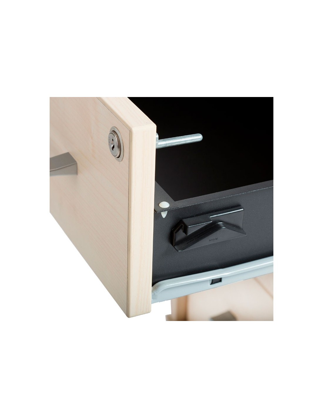 Estructura realizada en melamina de 19 mm en su totalidad, incluido trasera. Las 4 ruedas disponen de sistema de freno para la correcta fijación. Cerradura con 2 llaves plegables. Sistema de cierre centralizado para la confidencialidad deseada. Sistema antivuelco incorporado para una máxima seguridad. Tiradores metálicos con acabado metalizado. Cajones metálicos realizados en chapa de acero. Guías metálicas con rodamientos de Nylon.