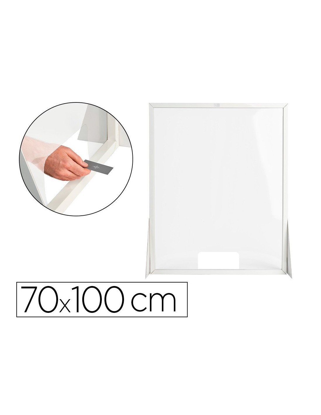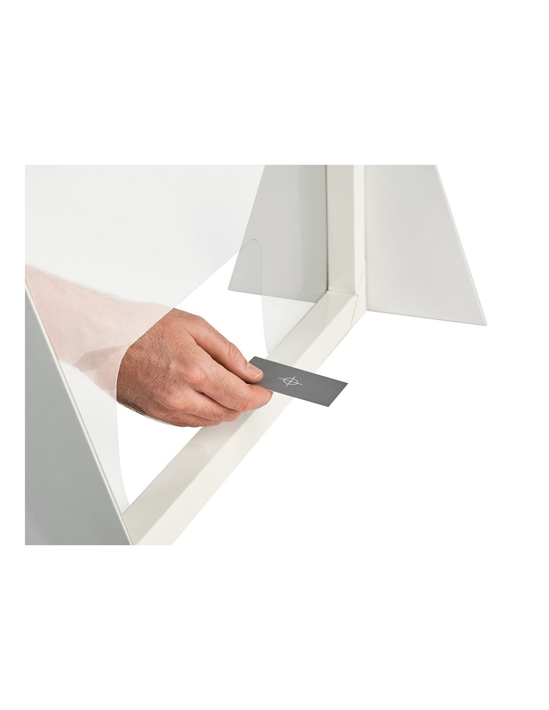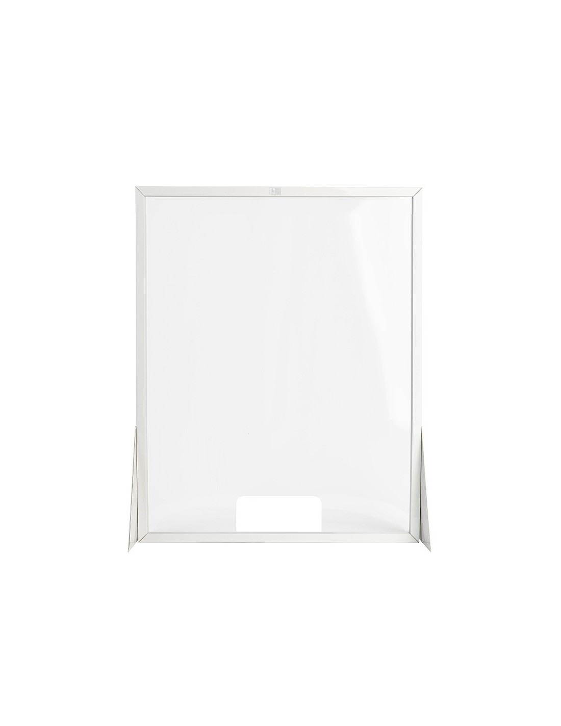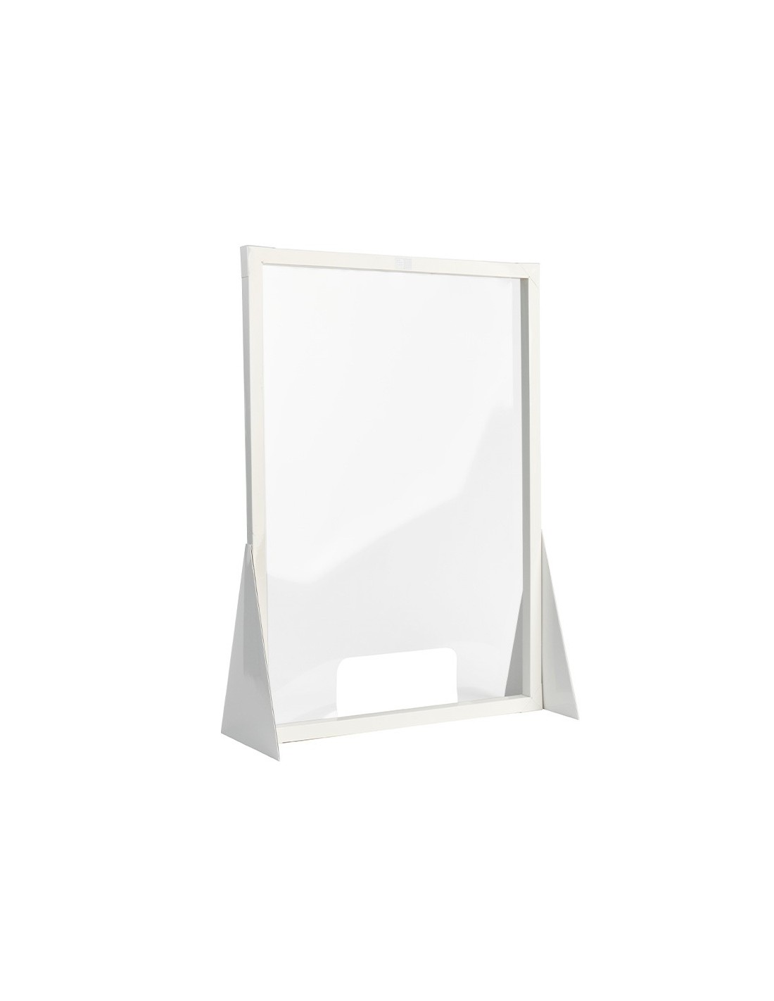 Pantalla de protección con perfil de cartón. Ligera pero estable. Ideal para el intercambio de documentos o pequeños objetos gracias a la ventana central inferior. Incluye dos peanas para una estabilidad más segura. Limpiar sólo con agua y jabón. Disponible en dos posiciones. Medidas de la ventana: 30 x 15 cm.