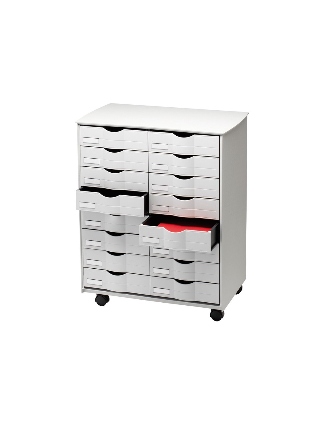 Mueble móvil de cajones. Con cajones para documentos de 240 x 320 mm. Fabricado en poliestireno de alto impacto. Tope de retención en cada cajón. Con cuatro ruedas giratorias. Incluye etiquetas y portaetiquetas. Se entrega semimontado, para solo tener que clipsar las fachadas de los cajones.