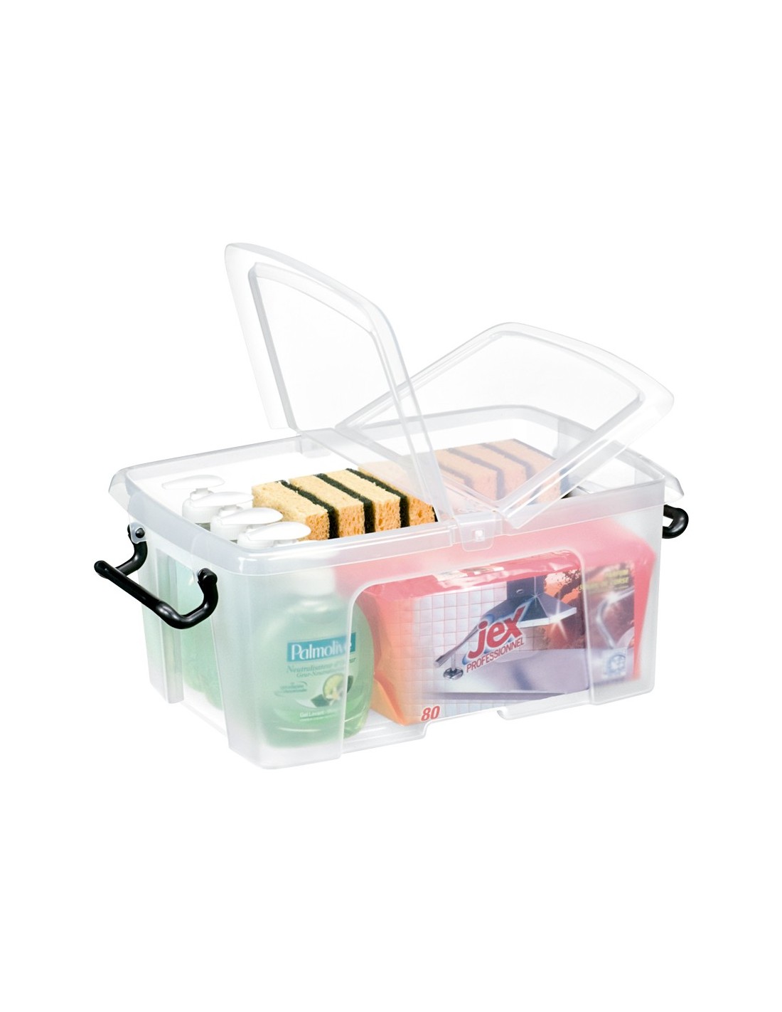 Contenedor de almacenamiento. Clip de apertura de la tapa en los 2 lados para un fácil acceso al contenido. 2 pinzas de mango proporcionan un cierre seguro. Borde ancho alrededor del perímetro para llevar fácilmente la caja. Ruedas para un mejor desplazamiento. Apilable. Contenido no incluido.