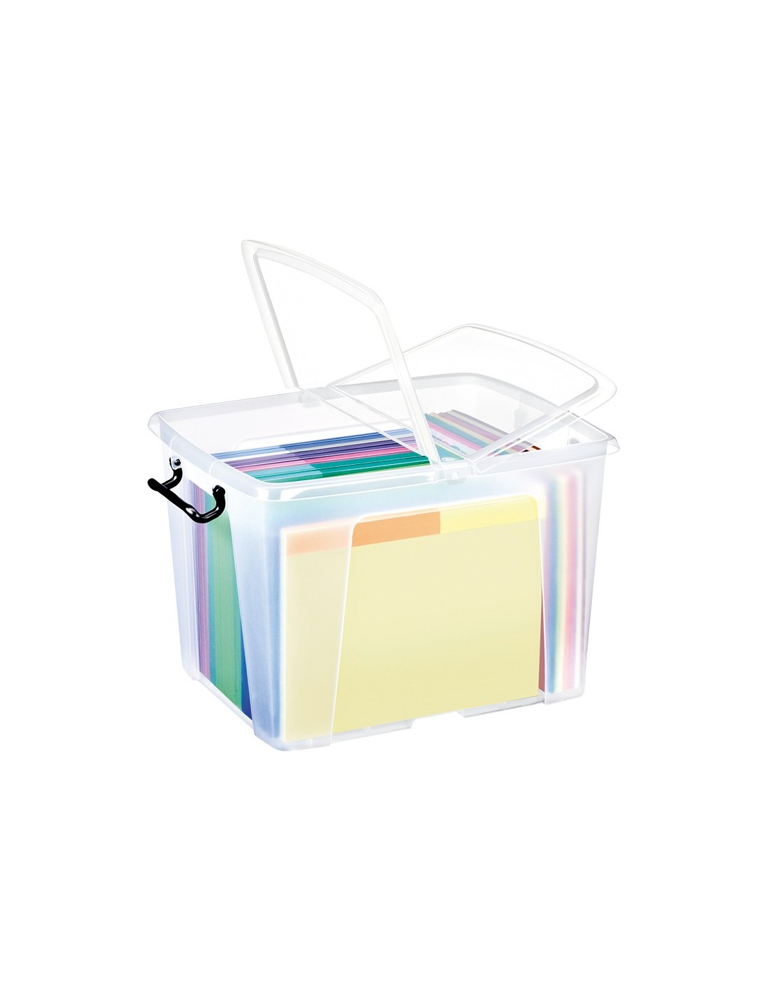Contenedor de almacenamiento. Clip de apertura de la tapa en los 2 lados para un fácil acceso al contenido. 2 pinzas de mango proporcionan un cierre seguro. Borde ancho alrededor del perímetro para llevar fácilmente la caja. Ruedas para un mejor desplazamiento. Apilable. Contenido no incluido.