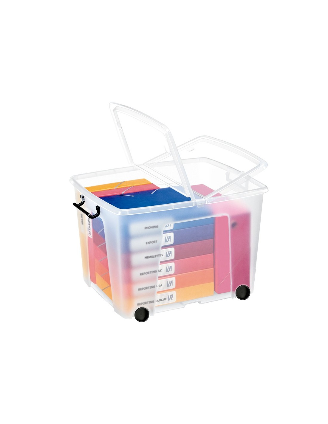 Contenedor de almacenamiento. Clip de apertura de la tapa en los 2 lados para un fácil acceso al contenido. 2 pinzas de mango proporcionan un cierre seguro. Borde ancho alrededor del perímetro para llevar fácilmente la caja. Ruedas para un mejor desplazamiento. Apilable. Contenido no incluido.