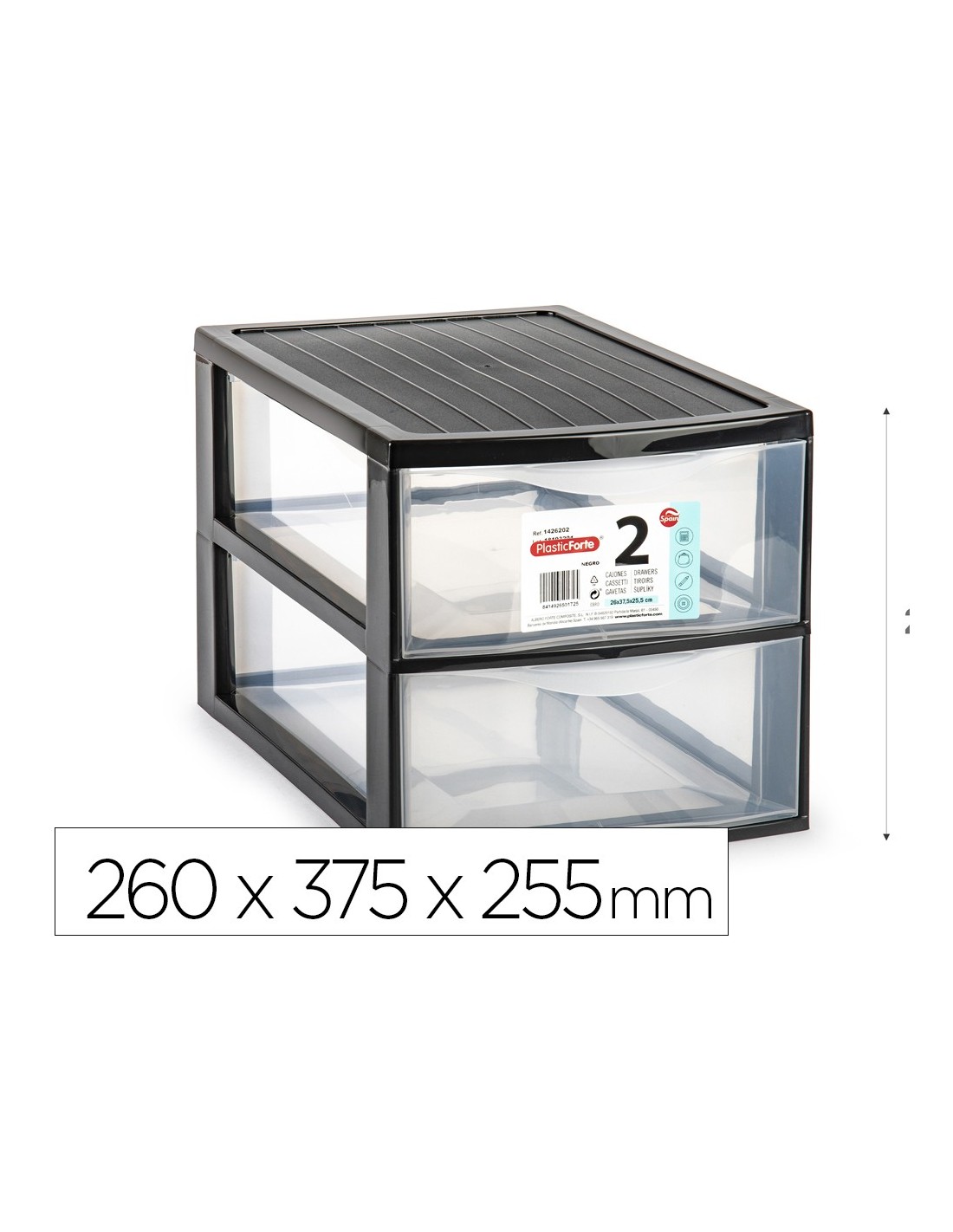 Cajonera sobremesa de 2 cajones fabricada en plástico resistente, lo que la hace compacta y funcional ideal para mantener el orden en escritorios y espacios de trabajo. Fabricada es España, combina practicidad y durabilidad para una organización eficiente. Color negro. Medidas: 260x375x255 cm.