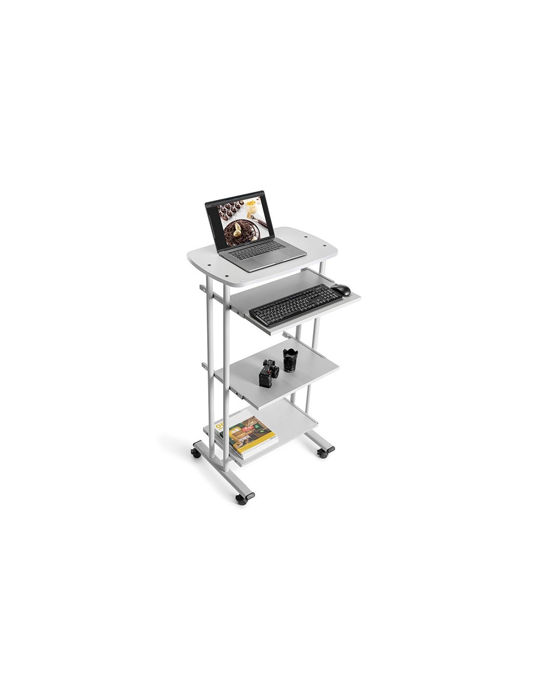 Mesa ordenador móvil de estructura metálica y embellecedores de pvc. Las bandejas son graduables en altura. Fác il montaje. Incorporan teclado extraíble. Se puede instalar para trabajar sentado o de pie.