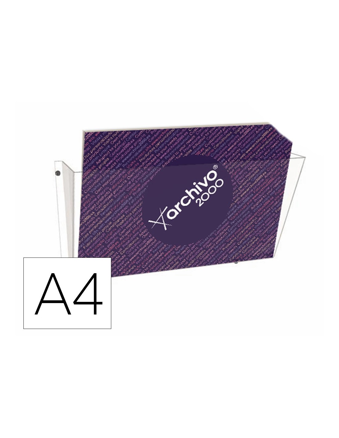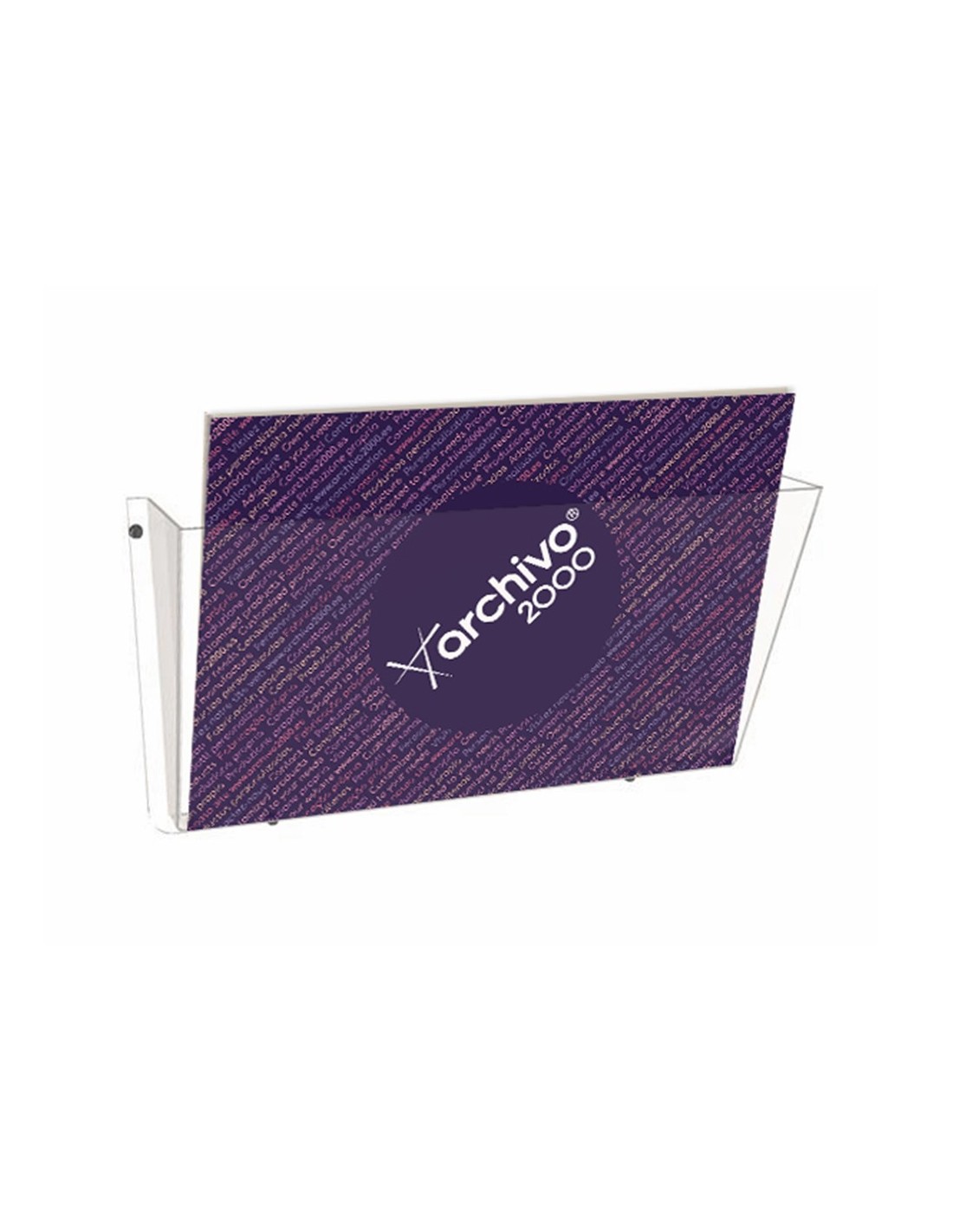 Portafolletos mural Archivo 2000 con 1 compartimento A4 horizontal. Fabricado en poliestireno ultra transparente de máxima calidad, muy resistente y estable. Fondo de cajetín de 40 mm. Incluye agujeros preperforados para sujeción en la superficie. Opción de formar combinaciones a tu medida. Incluye kit de fijación. Color cristal transparente. Medidas exteriores: 75x370x180 mm. Fabricado en España.