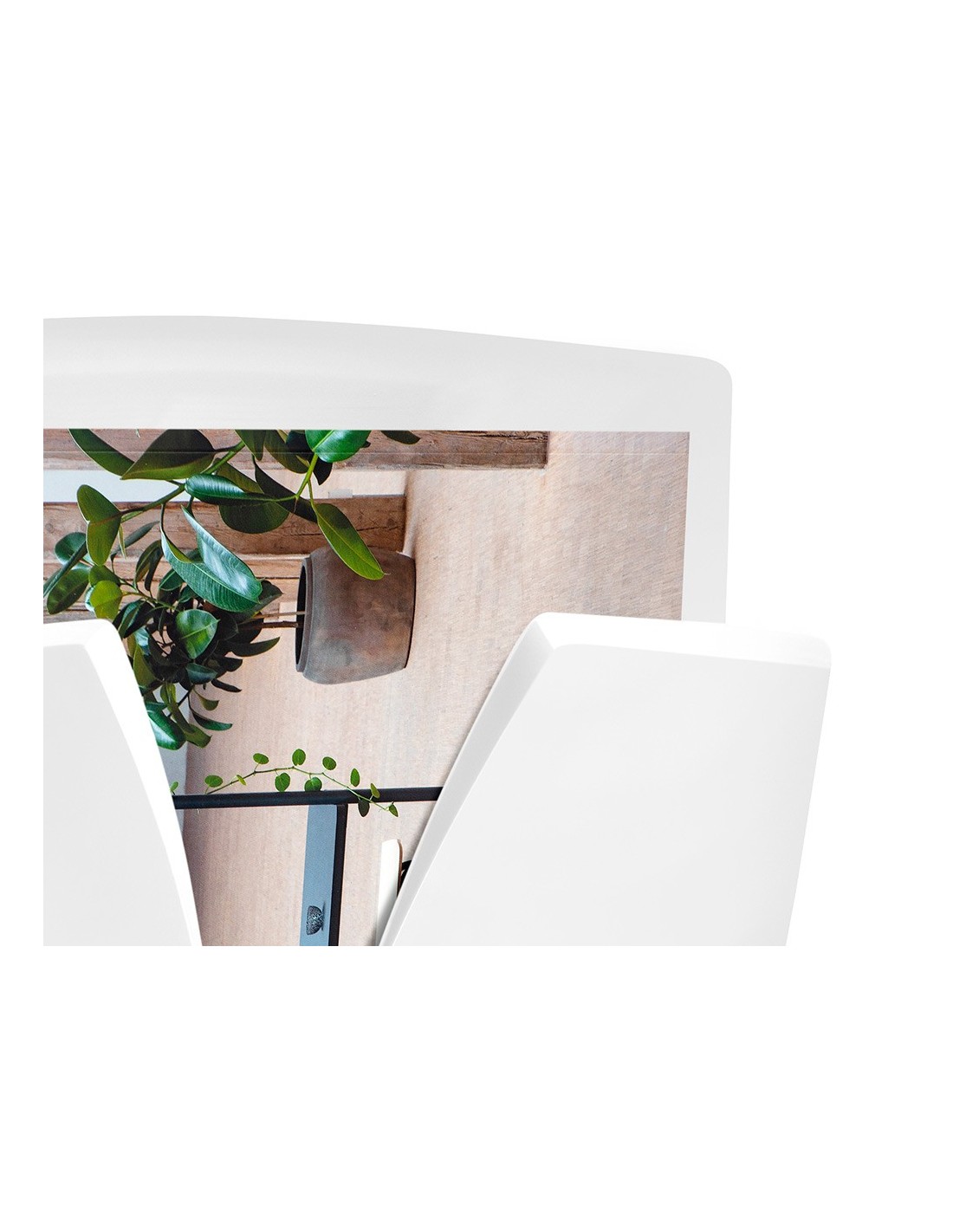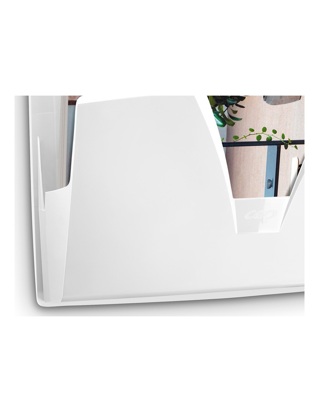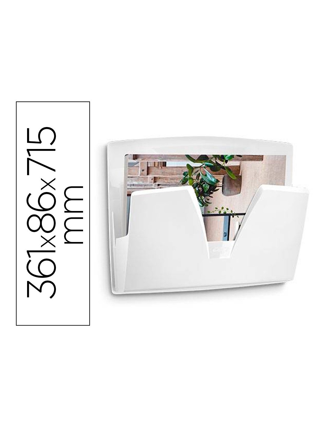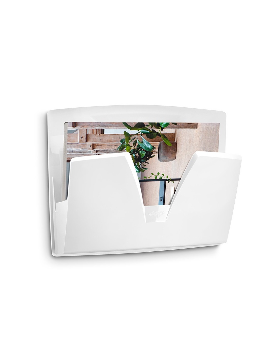 Expositor de pared con propiedades antibacterianas. La adición de un agente bactericida de iones de plata elimina la presencia y el crecimiento de las bacterias de por vida. Permite guardar documentos de hasta 24 x 32 cm. Muescas en los laterales para insertar formatos muy grandes (DIN A3+), tubos de dibujo... Amplia apertura en forma de V para un excelente agarre de los documentos. Kit de fijación suministrado (tornillos, tacos). Soporta una carga de 2,5 kg. PS resistente, 100% reciclable. Color: blanco ártico. Medidas: 36,1 x 27 x 8,6 cm.