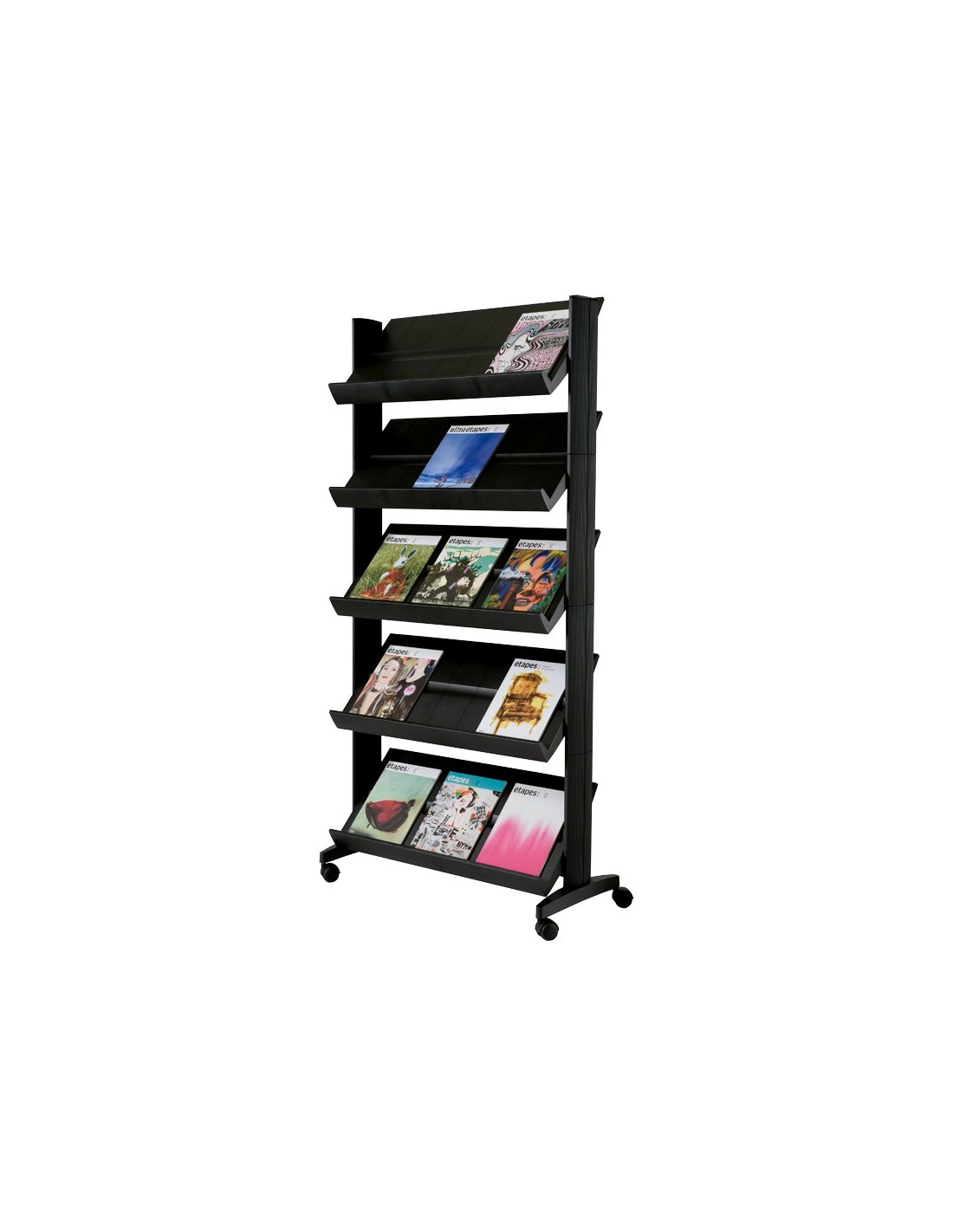 Expositor móvil. Fácil de desplazar gracias a sus cuatro ruedas. De estructura metálica con refuerzos de metal y acabado de plástico negro. 5 repisas de alto impacto. Visión total de los documentos. Borde de 4 cm. Color negro. Medidas: 85,5 x 167,5 x 38,5 cm. Peso: 15.33 kg.