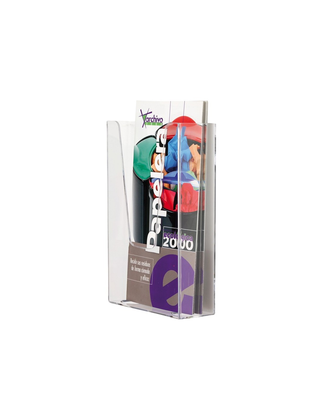 Expositor de metacrilato de gran resistencia para folletos y otros documentos. Posición vertical. Un compartimento. Su color transparente cristal asegura una atractiva presentación y una fácil localización del contenido. Con agujeros traseros para facilitar su colocación en la pared. Formato 1/3 DIN A4. Medidas: 11,5 x 18 x 4,5 cm.