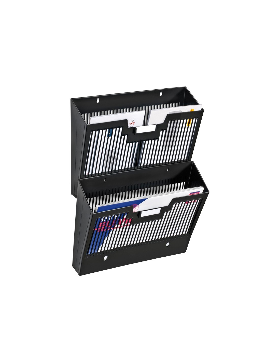 Expositor de rejilla de gran capacidad para documentos DIN A4 y folio. Acoplable en vertical. Con portaetiquetas central. Apertura ancha para fácil acceso. Equipado con un soporte de etiqueta central, para poder unir las cestas en grupos o por separado. Fabricado en poliestireno reciclable de alto impacto. Color negro. Medidas: 25,7 x 36 x 9,5 cm.