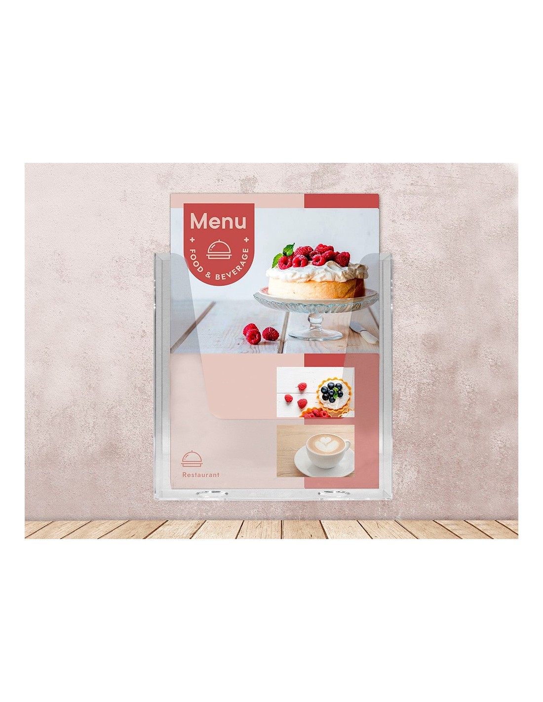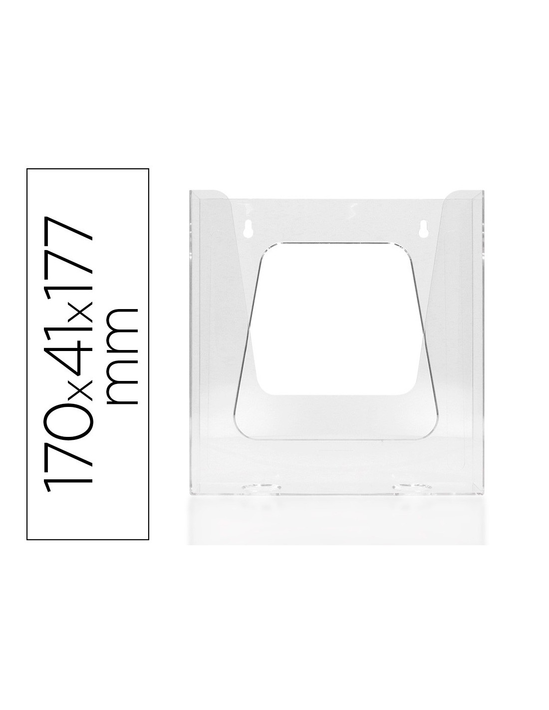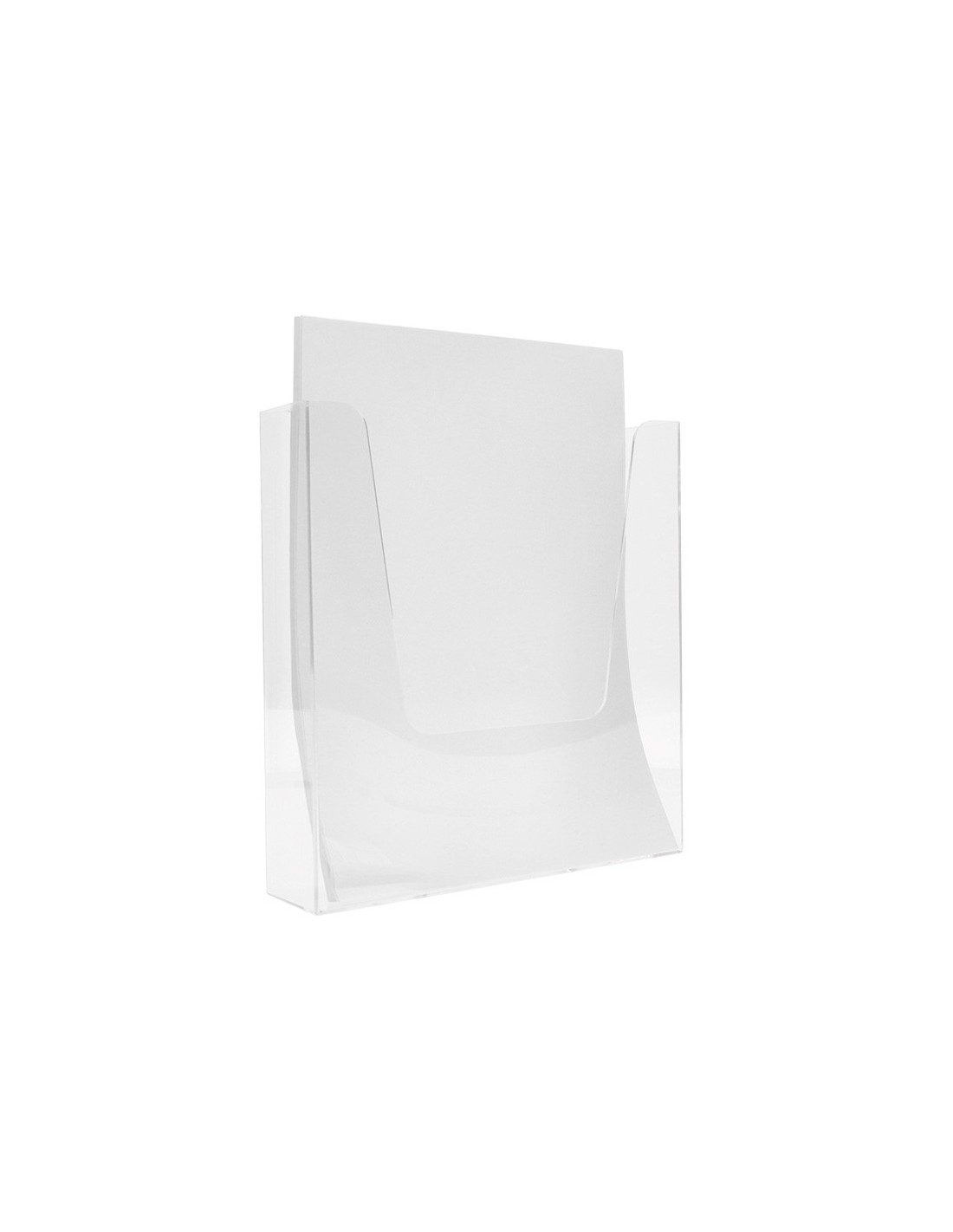 Portafolletos mural Archivo 2000 A5 vertical. Fabricado en poliestireno ultra transparente de máxima calidad y resistencia. Fondo de cajetín de 40 mm. Diseñados con hendidura frontal para un rápido acceso a los documentos y con agujeros traseros para facilitar su colocación en la pared. Color cristal transparente. Medidas exteriores: 45x175x180 mm. Fabricado en España.