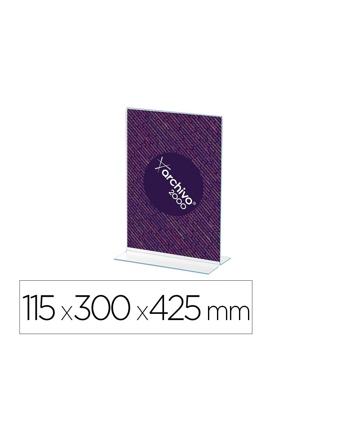Expositor sobremesa Archivo 2000 Premium ultra transparente en forma de T DIN A3 vertical Espesor 2 mm. Fabricado en poliestireno ultra transparentede gran calidad y resistencia. El documento se introduce por la parte inf erior. Amplia base que lo hace muy estable. Fabricación española. Medidas exteriores: 115x300x425 mm.