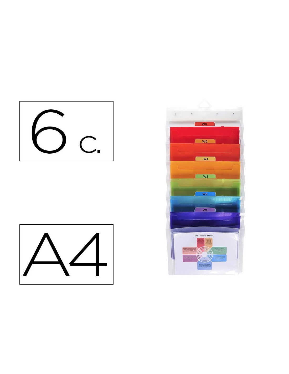 Este clasificador mural Crystal, fabricado íntegramente en plástico, permite archivar y exponer documentos cuidadosamente clasificados en 6 compartimentos. Puede utilizarse para mostrar instrucciones, organizar tareas o incluso archivar documentos para compartirlos dentro de una entidad. Disponede un gancho de plástico retráctil para fijarlo a la pared o colocarlo en un gancho. Cuando está cerrada, se sujeta con gomas elásticas. Los compar timentos están formados por bolsillos de plástico de 2/10 de color, que sepueden desmontar. Cada uno de estos bolsillos puede identificarse con los portaetiquetas y las etiquetas suministradas. En la parte delantera, este clasificador está equipado con un bolsillo frontal transparente que permi rmite identificar o añadir instrucciones.