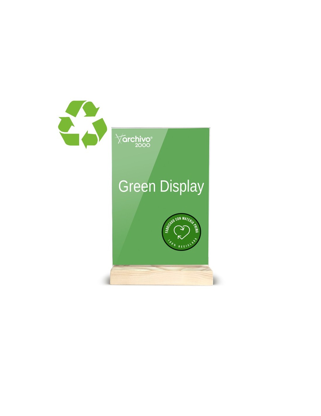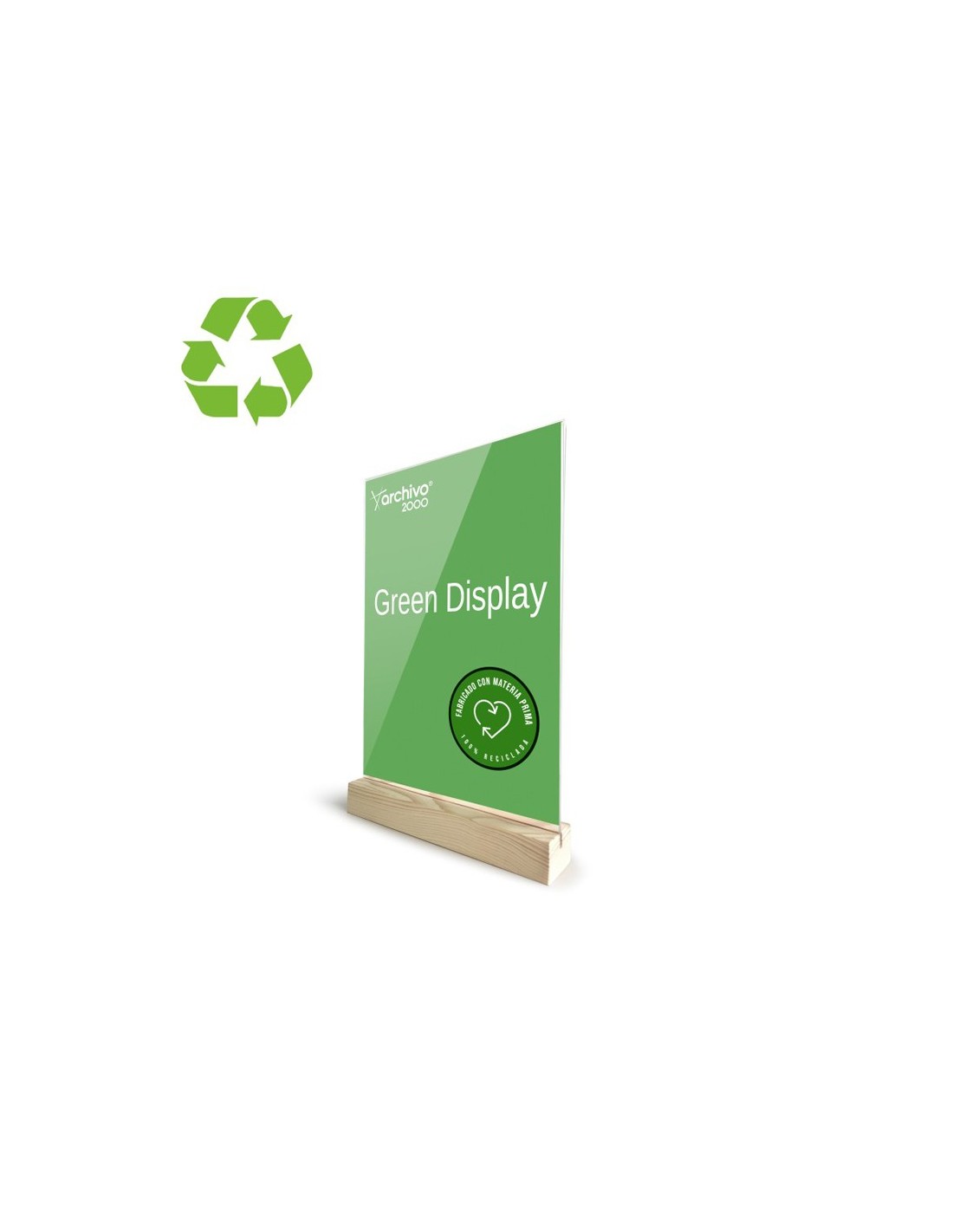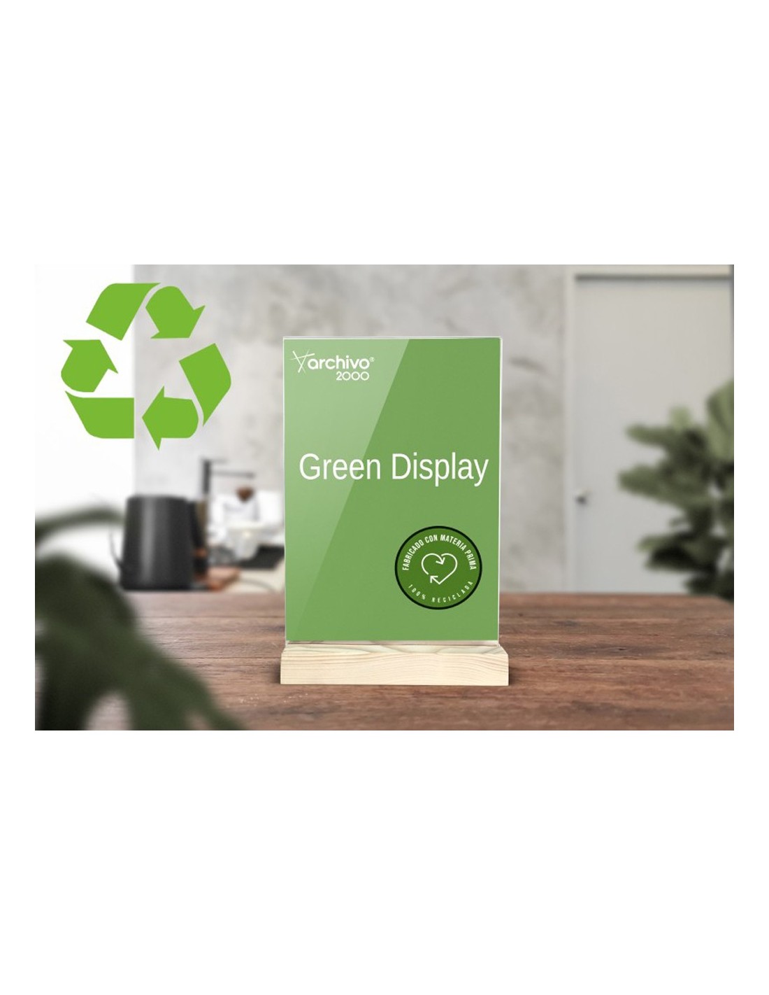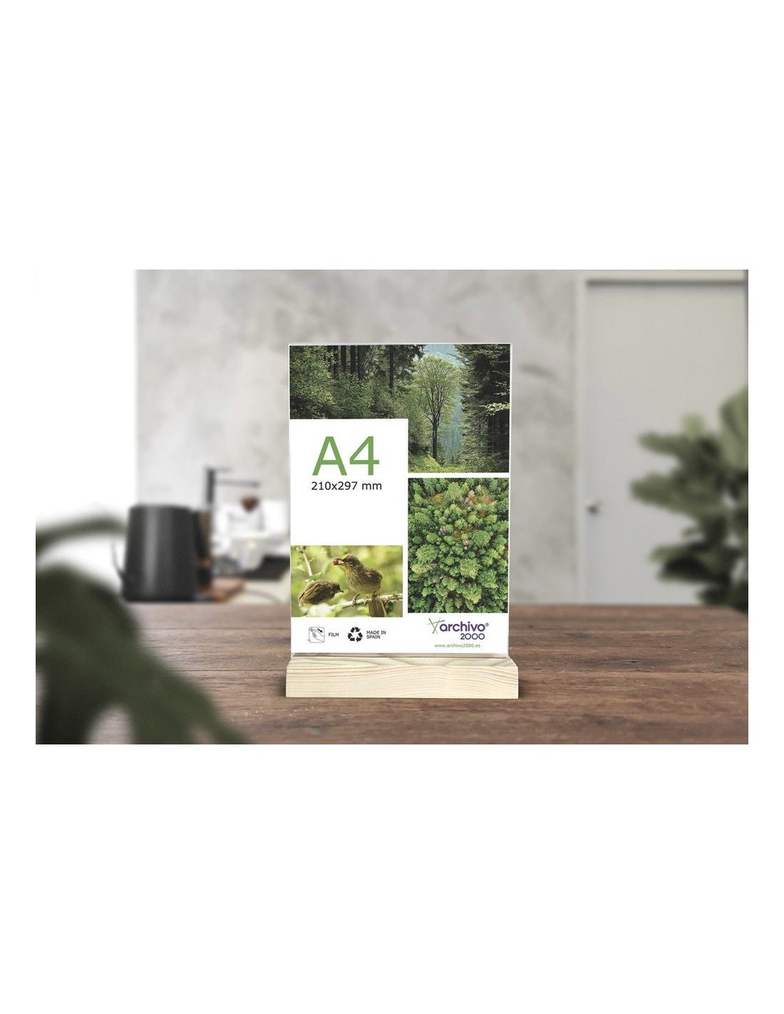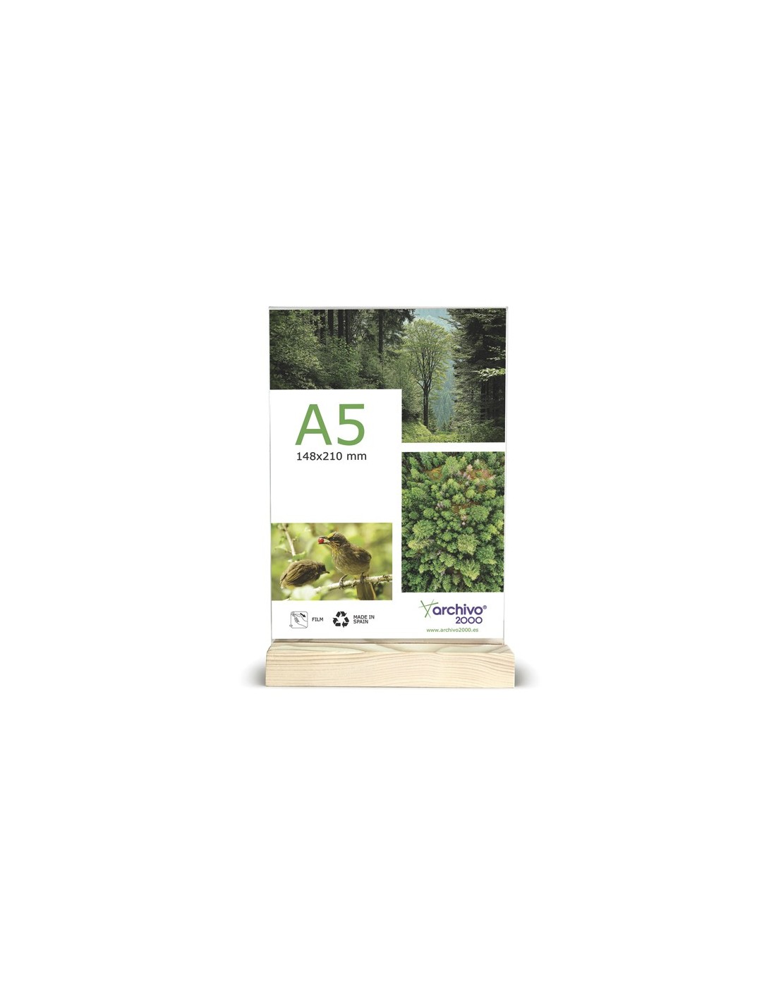 Expositor de sobremesa sostenible Archivo 2000 doble cara A5 vertical con base de madera. Formato A5 vertical. Fabricado en metacrilato ultra transparente y resistente. Base de madera con acabado lijado y canal pasante, ranura anticaída adaptada a cada formato para una mayor seguridad del documento. Color cristal transparente y madera. Tamaño de la madera 40x150x30 mm. Medidas exteriores: 40x150x240 mm. Fabricado en España.