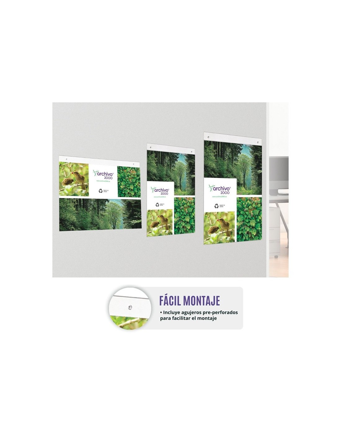 Expositor mural con taladros Archivo 2000 A3 horizontal. Fabricado en acrílico ultra transparente de gran calidad y resistencia. Con agujeros pre-perforados para facilitar el montaje en la pared. No es necesario quitar el expositor de la pared para cambiar el documento, se sustituye fácilmente deslizándolo por cualquiera de los dos laterales. Color cristal transparente. Medidas exteriores: 420x325 mm. Fabricado en España.