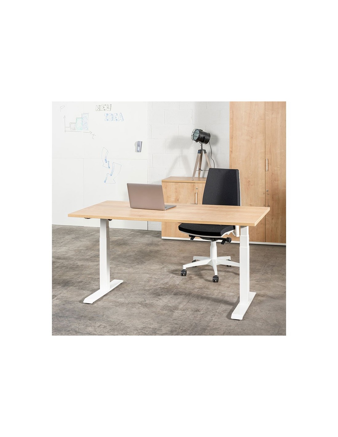Mesa con sistema de regulación eléctrica en altura para cubrir las necesidades de trabajo más exigentes. Superficie de mesa con melamina de 25 mm de grosor con canto de PVC de 2 mm. Acabados del tablero disponibles en haya, gris, blanco y roble. Estructura realizada en tubo y chapa de acero acabado en epoxy RAL 9010, con columna a tres niveles regulable en altura (mínimo 620 mm - máximo 1260 mm) mediante dispositivo de regulación eléctrico, para conseguir la altura deseada y trabajar de una forma fácil y rápida. Incluye niveladores de regulación en altura de hasta 2 cm.