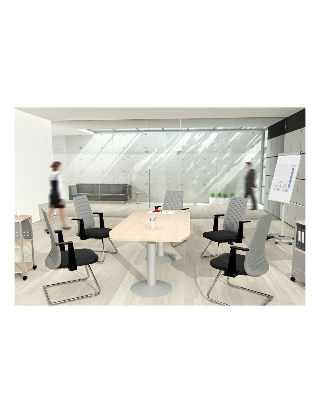 Mesa de reunión con estructura de melamina o acero de generosas dimensiones ideal para reunirse con varios integrantes en una sola mesa. Compuesta de pies realizados en melamina de 25 mm de grosor con regulación independiente de 2 cm, o cilíndricos en formato columna realizado en plancha metálica pintada epoxy, color según modelo. Tablero de melamina de 25 mm de grosor, color según modelo, con canto de 1 mm de grosor del mismo color. Disponible en color haya, gris o blanco.