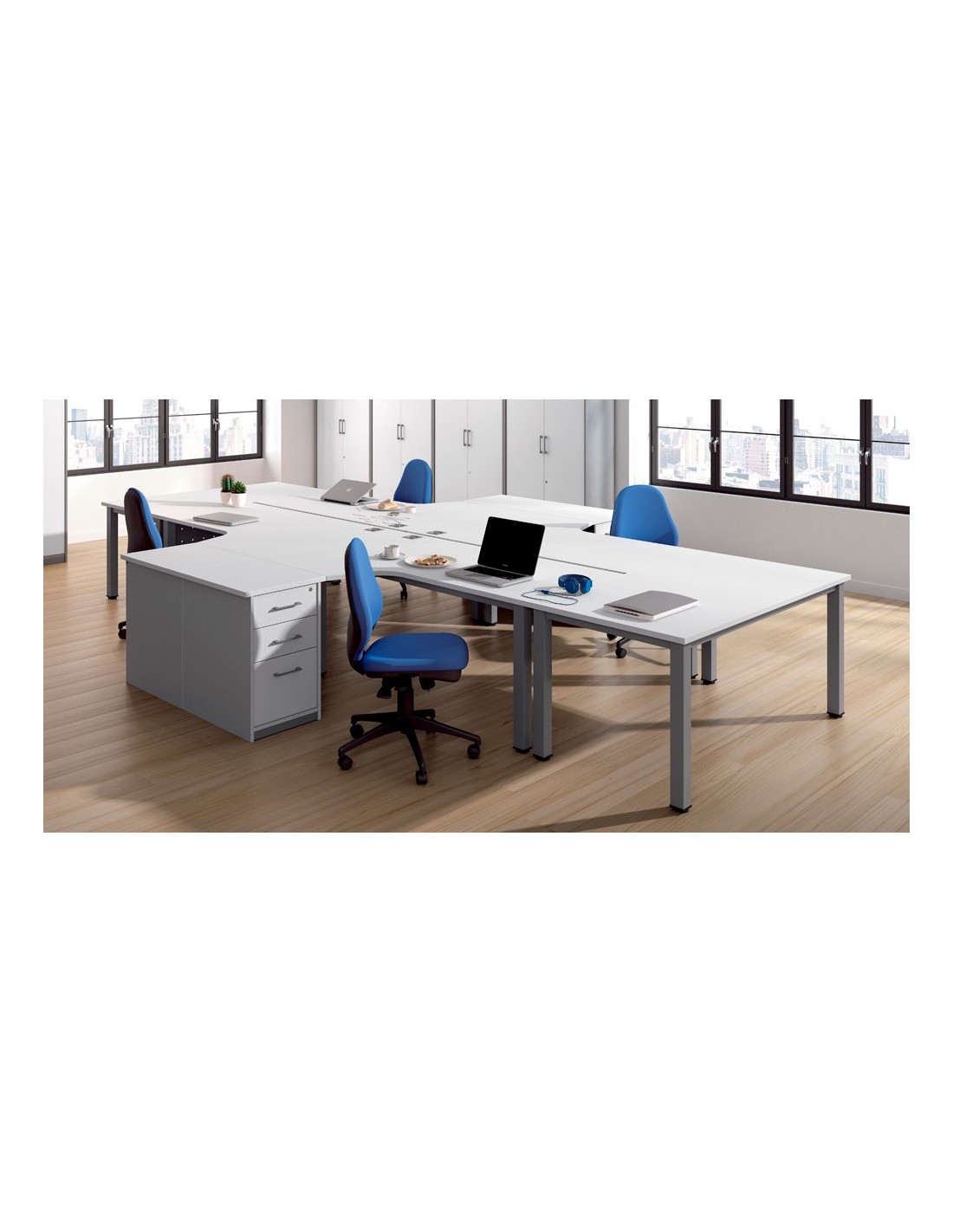 La línea EXECUTIVE, está diseñada con líneas suaves y rectas. Creada para mantener un perfecto equilibrio entre operatividad y estética. Estructura realizada en tubo de acero de 40 x 30 mm de sección fijados entre ellos y a los 4 pies mediante 4 piezas de aluminio fundido. Los pies son de tubo de acero de 60 x 60 mm de sección e incorporan niveladores de regulación en altura de 5 cm. Todo ello pintado según modelo. El tablero es de melamina de 25 mm de grosor color según producto canteado en PVC de 1 mm del mismo color.
